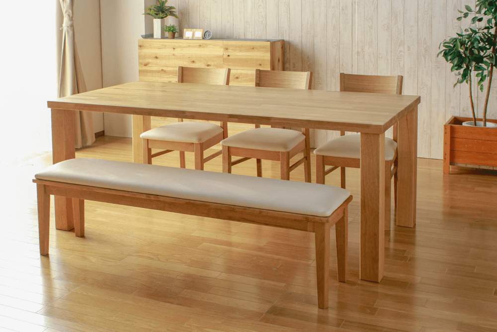 無垢材を使用した北欧テイストのダイニングテーブル。必要以上に主張しない、スッキリとしたデザインが魅力です。