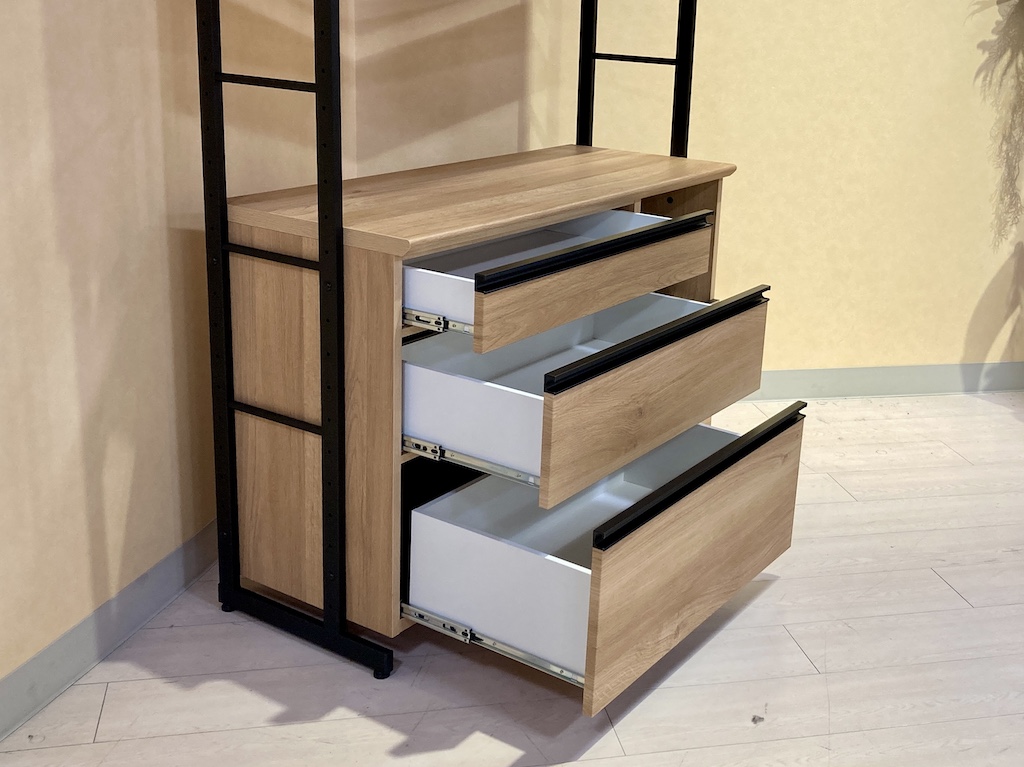 見せる収納を楽しめる、パンチングボード仕様のミドルボードです。引出しは大容量でDVDの収納にも便利です。お洒落で便利な飾る収納で、暮らしに遊び心とワクワクを。