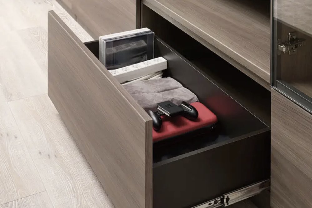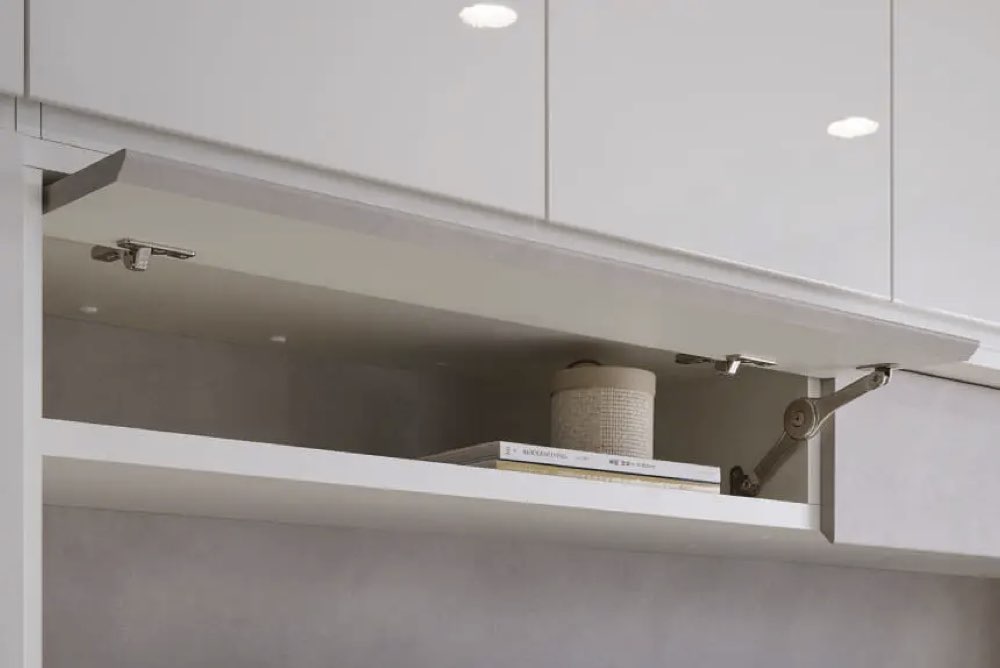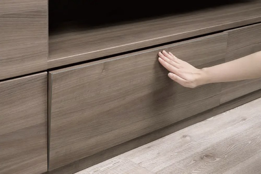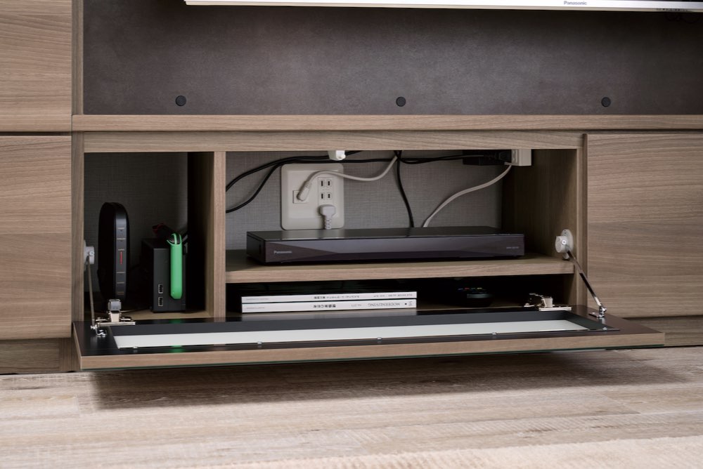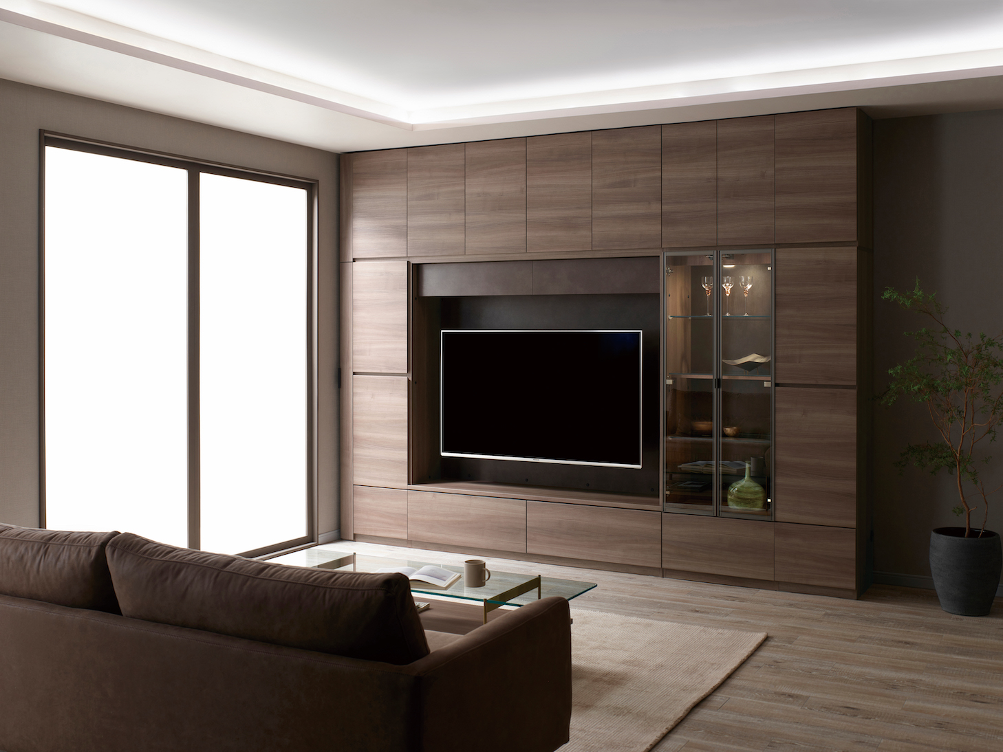 無駄のないフラットな扉デザインが、インテリアに自然と溶け込みます。 中央のオープンスペースには、濃淡の美しい抽象柄を 取り入れることで、空間全体に奥行きと広がりを演出。 視線を引き込むような印象的なアクセントとなってます。 上部のフラップ扉は意図的に奥浅設計にすることによって、デザインにリズムと抜け感をプラス。 収納力を確保しながらも、圧迫感を抑えた開放的な佇まいに仕上げました