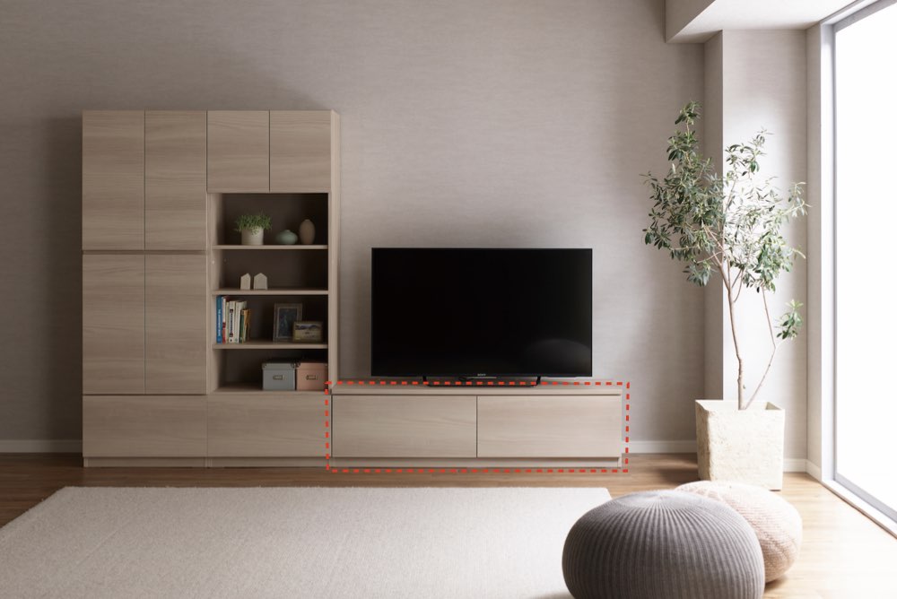 TVボード・キャビネットから天井までの高さが21〜89.4cmの場合は上置を、8〜20.9cmの場合はフィラーを選びます。
