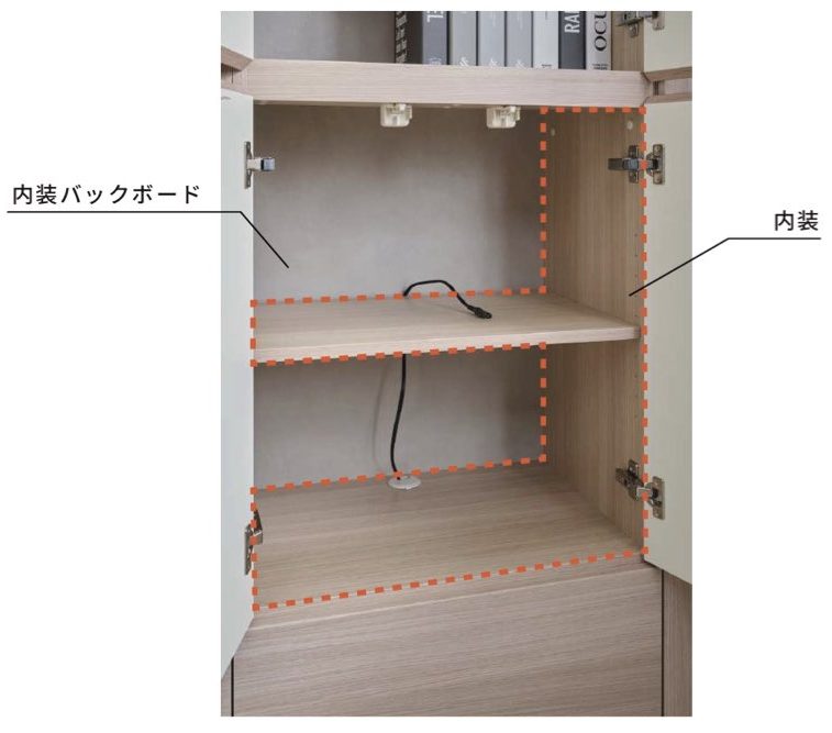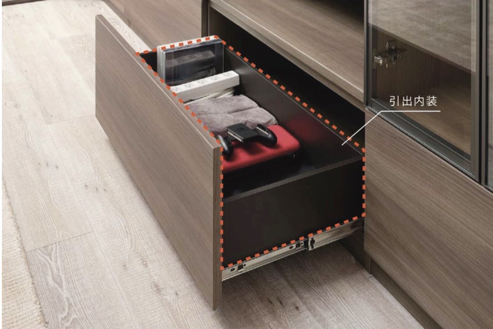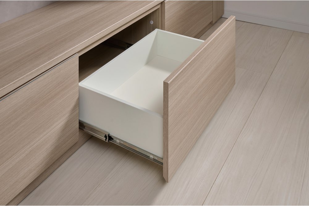 無駄のないフラットな扉デザインが、インテリアに自然と溶け込みます。 中央のオープンスペースには、濃淡の美しい抽象柄を 取り入れることで、空間全体に奥行きと広がりを演出。 視線を引き込むような印象的なアクセントとなってます。 上部のフラップ扉は意図的に奥浅設計にすることによって、デザインにリズムと抜け感をプラス。 収納力を確保しながらも、圧迫感を抑えた開放的な佇まいに仕上げました