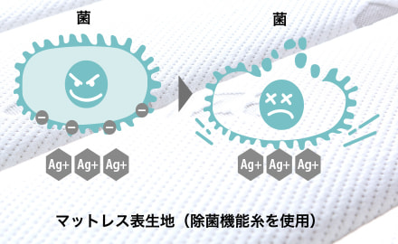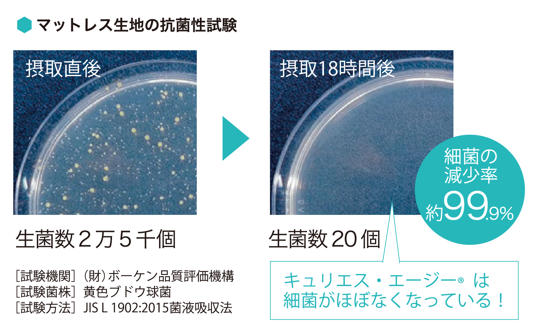 除菌機能「キュリエス・エージー®」は、銀イオンの力で付着した細菌を直接除菌します。悪臭の原因菌も除菌し、いつも清潔を保ちます。銀イオンによる除菌機能は後加工ではなく繊維自体が有しているため、機能耐久性に優れ、生地が劣化しない限り半永久的に効果が続きます。高温多湿な日本の寝具の衛生面をサポートします。99.9%の除菌で安心を当たり前に!!