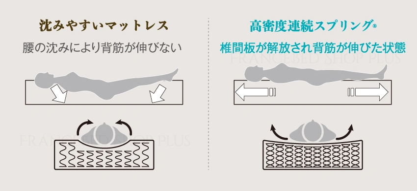 立っているときは重力うけて縮んだ椎間板は、眠るときには解放され伸びます。高密度連続スプリングのマットレスは、カラダを面で支えるから背筋が伸び解放された状態のまま眠れます。カラダの一部が極端に沈み込みまず余計な力を使わずに自然な寝返りとよい姿勢が維持できるのです。表面は柔らかく内部はしっかりの3層構造。表面クッションで腰・背中などカラダを面全体でしっかり支え、マットレス内部で体圧を分散、ソフトでふんわりとした感触を与えることで、カラダに負担をかけず自然な体勢での眠りを実現します。
