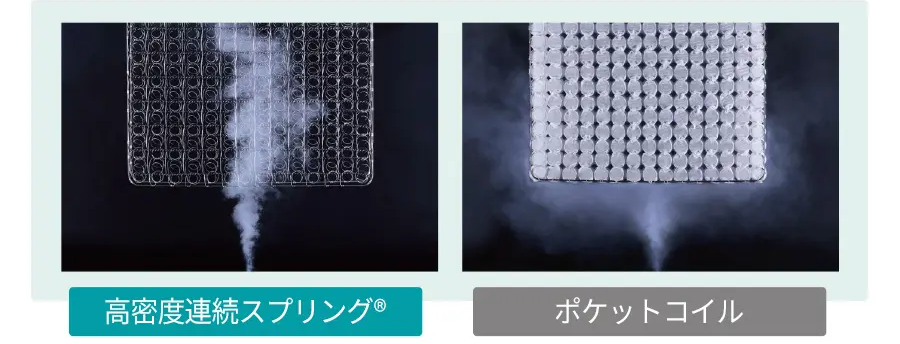人は眠くなると手足の温度が高くなり、眠りはじめると深部体温(カラダの内部の温度)を下げるために約200ccの汗をかきます。よい眠りのために、眠りはじめにどれだけ深く眠れるかが重要で、高密度連続スプリング®マットレスなら、通気性がよく、汗を速やかに通し、発散させるのでムレ感を感じることがありません。そのため寝つきがよく、よい眠りへと導くことができます。