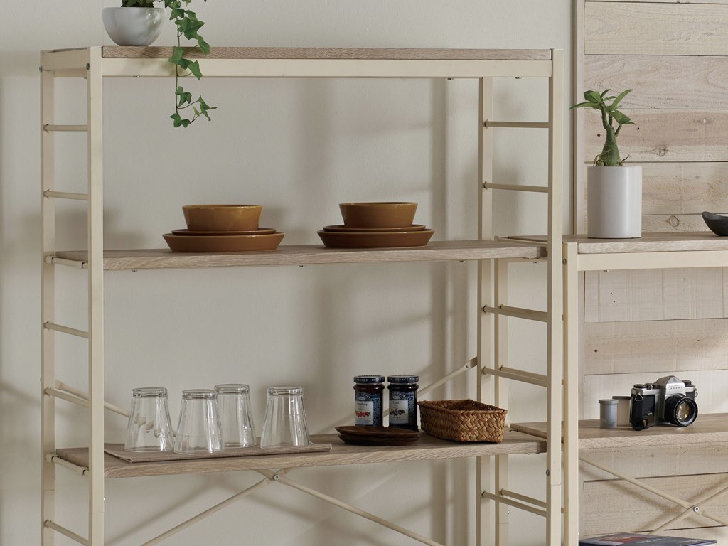 棚板は115mmピッチで高さ調節が可能なので、本・雑貨・食器・観葉植物など収納するものに応じで自由にレイアウトできます。