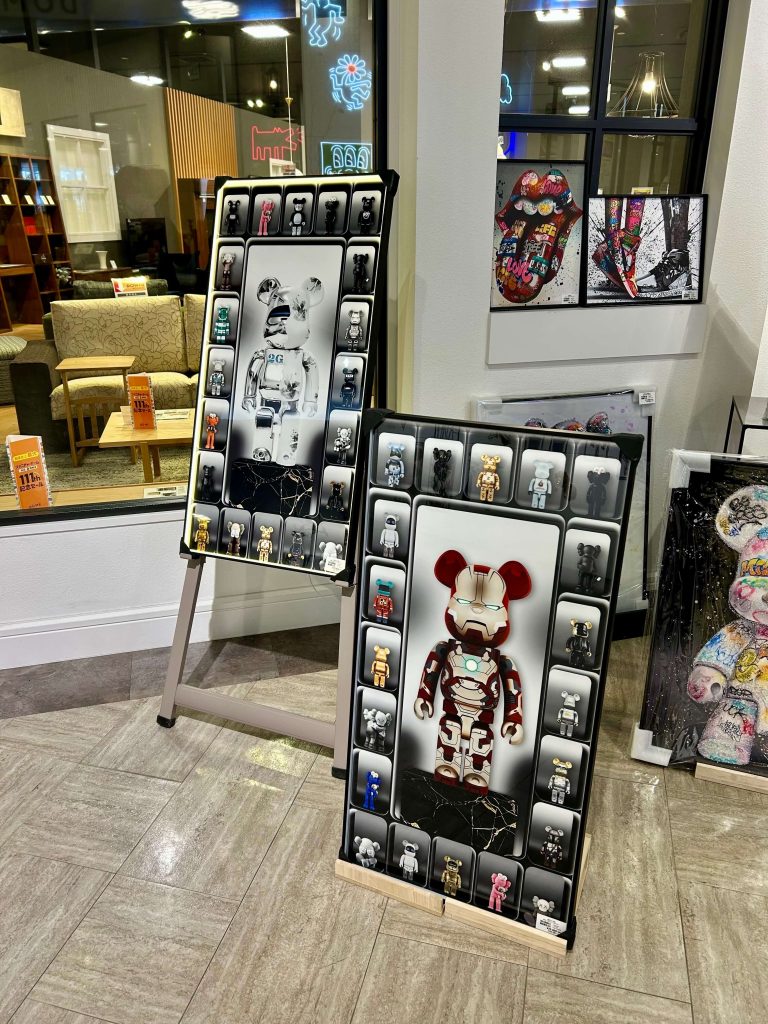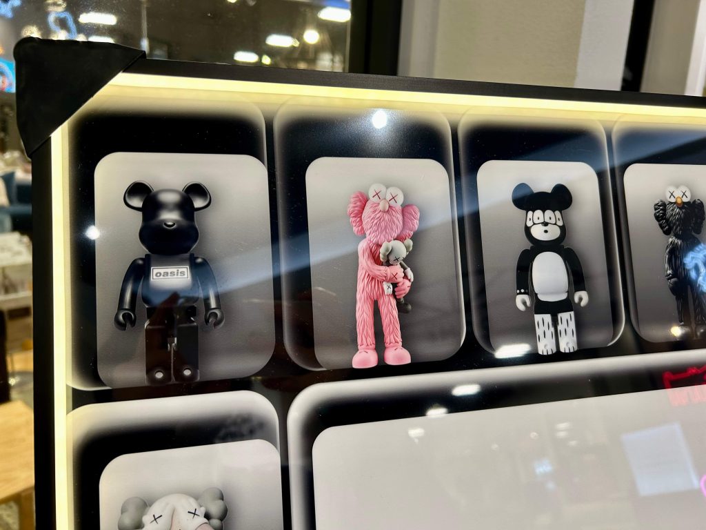 縁にLEDライトが付いた、ベアブリックのオマージュアートパネルです。ライトを付けるとスマホ風になります。ライトは調光機能付き。
