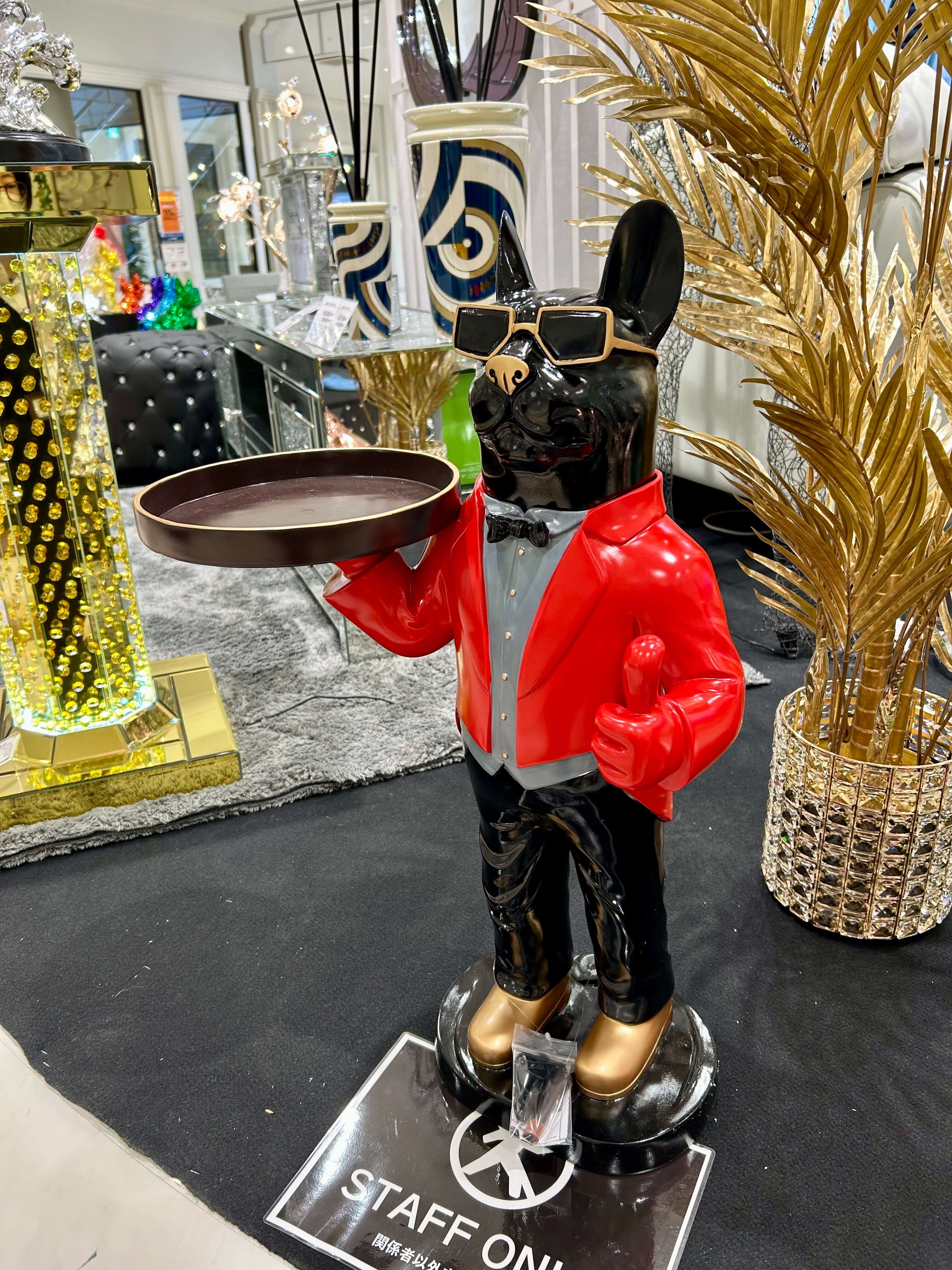 鮮やかな赤いジャケットが目を引く印象的なオブジェです。Bluetoothスピーカー付きで音楽も流せます♪