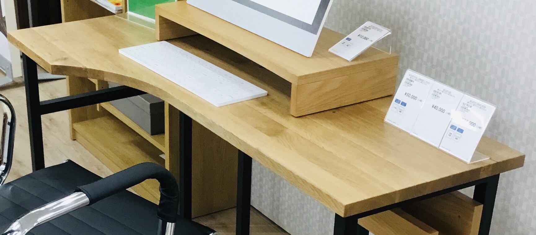 こちらのデスクは、①材質(2種) ②横幅と奥行のサイズ ③天板形状がオーダーできる商品となっております。