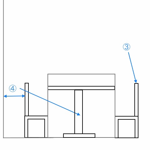 ④後ろ側のスペースが少ない場合、テーブルの脚を2本脚(T字、ロの字)にすれば、イスを引くスペースが少なく出入りでき、床のキズも少なくなります。