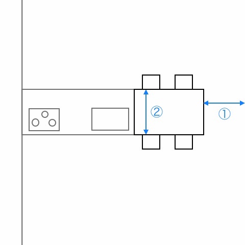 ②テーブルの短手はキッチンの奥行き以下で隙間が出ない直線、直角の形状を選ぶ。