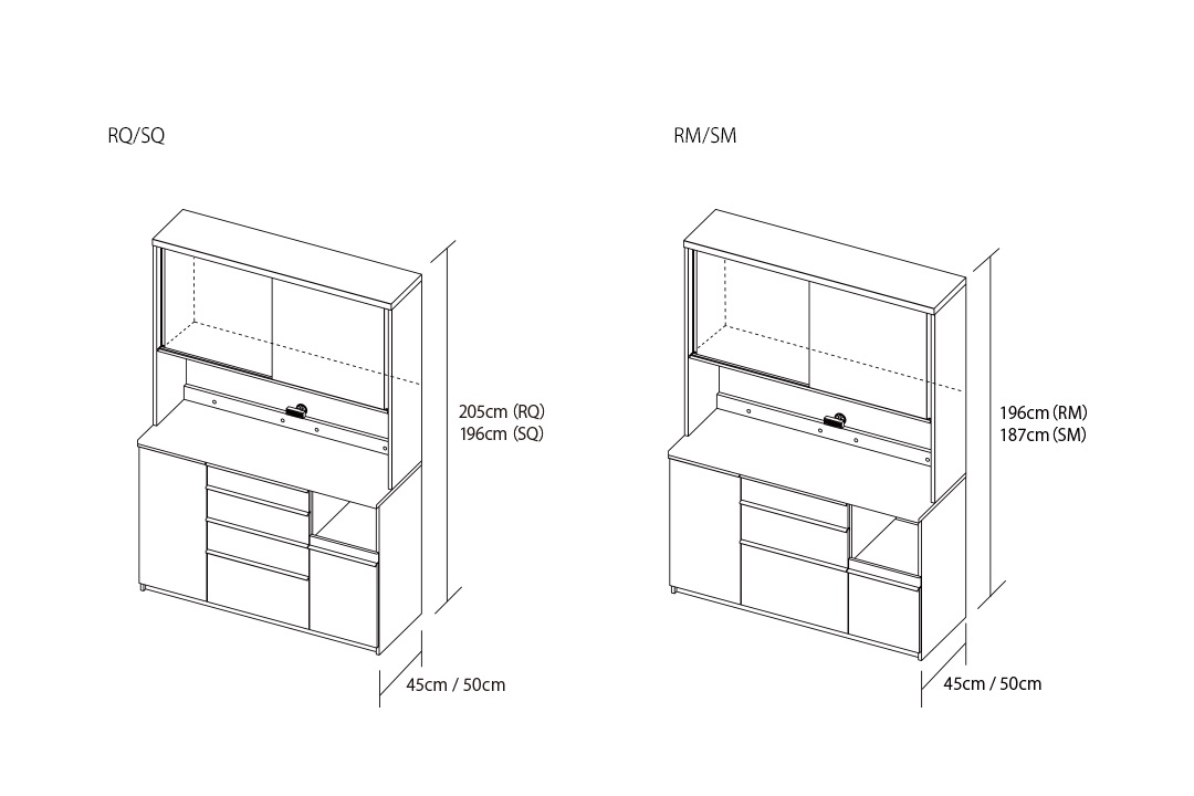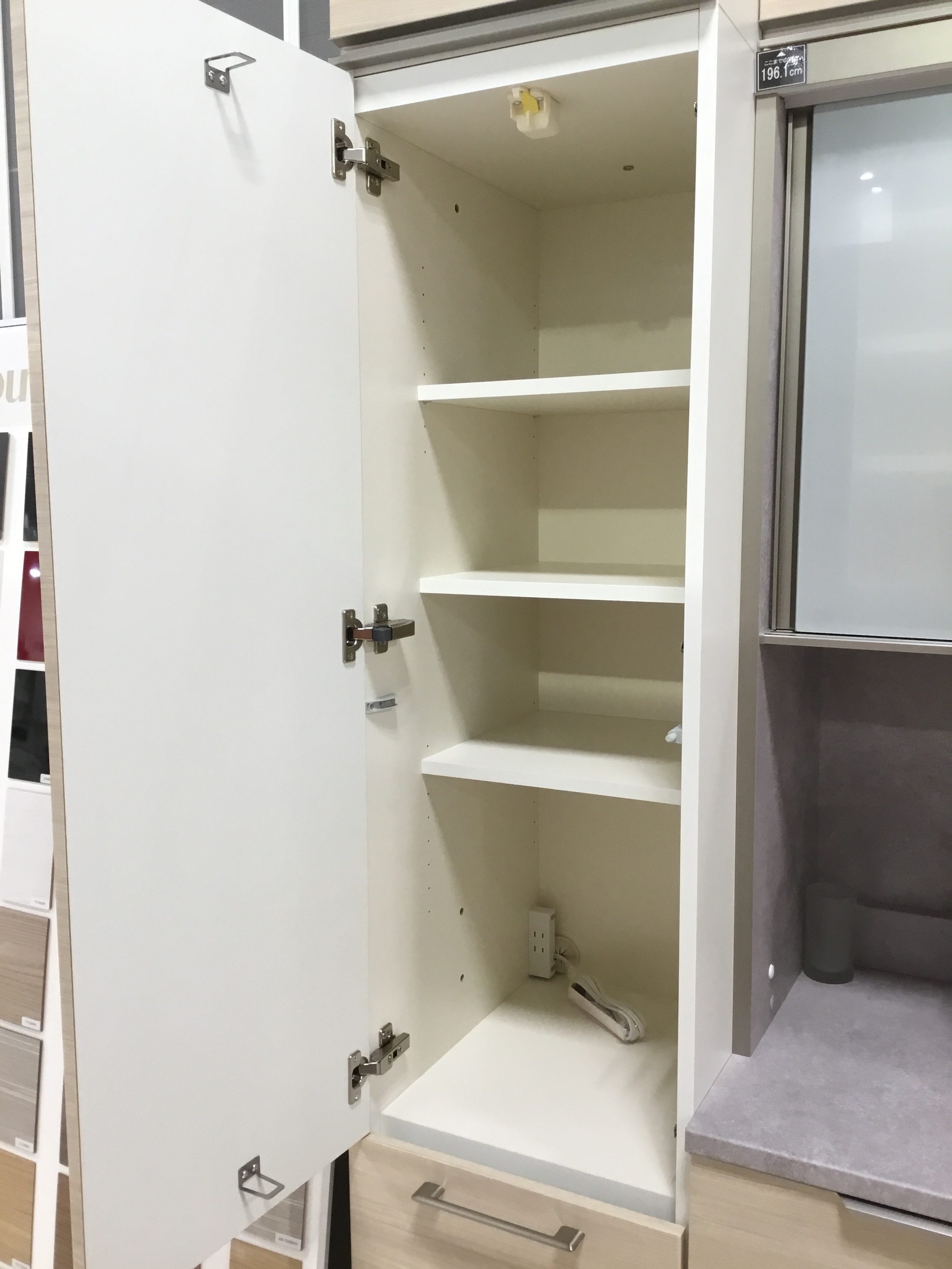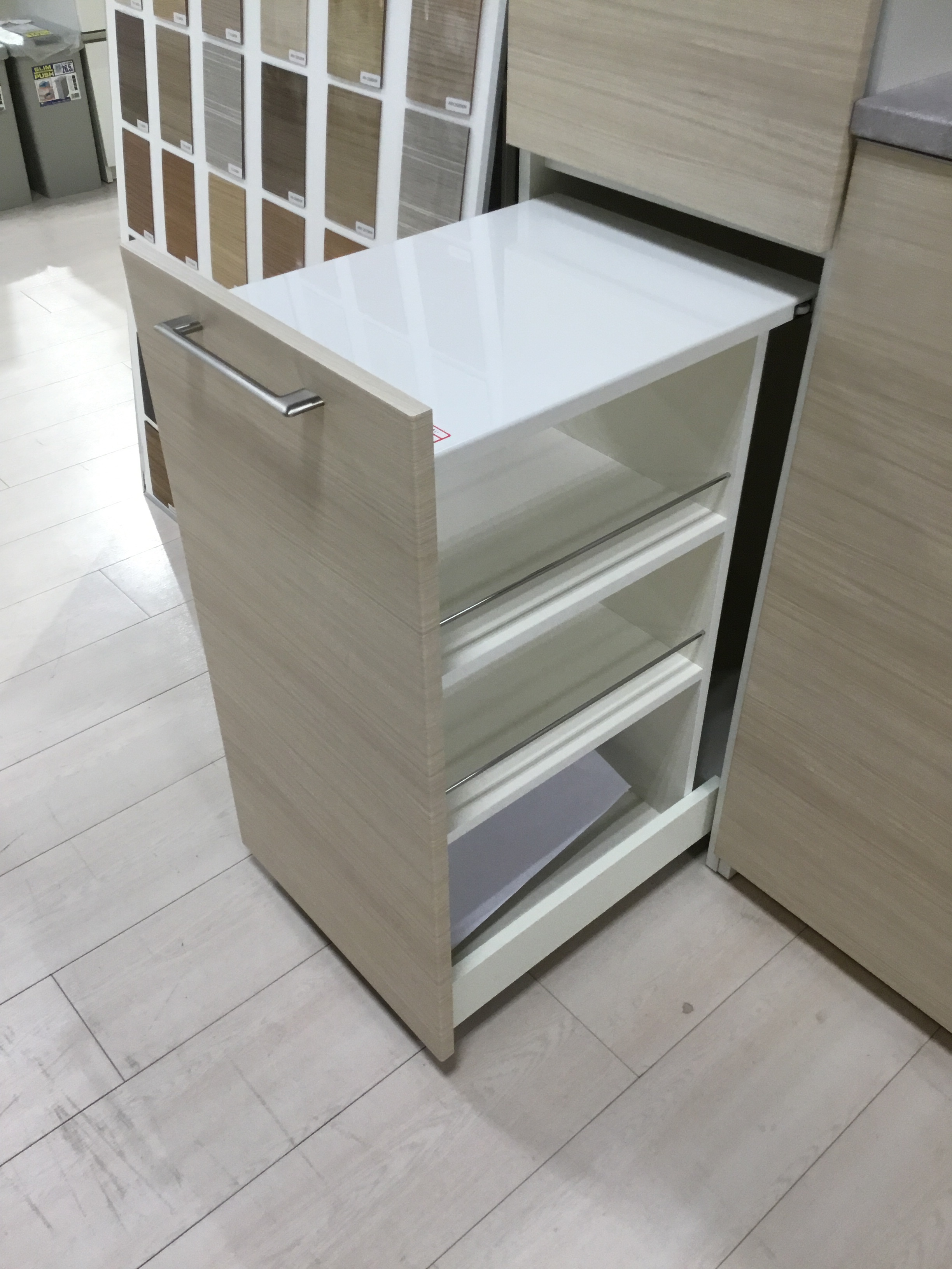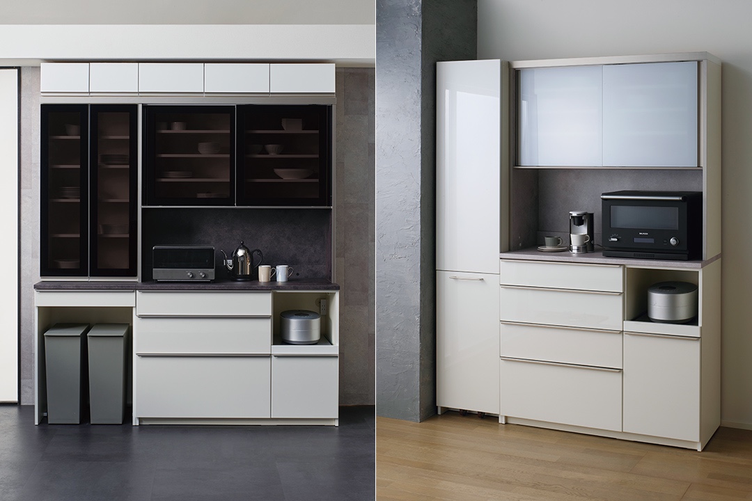 スタンダードなオープンキャビネットと合わせて食品類や家電収納ができるスリムストッカーがございます。