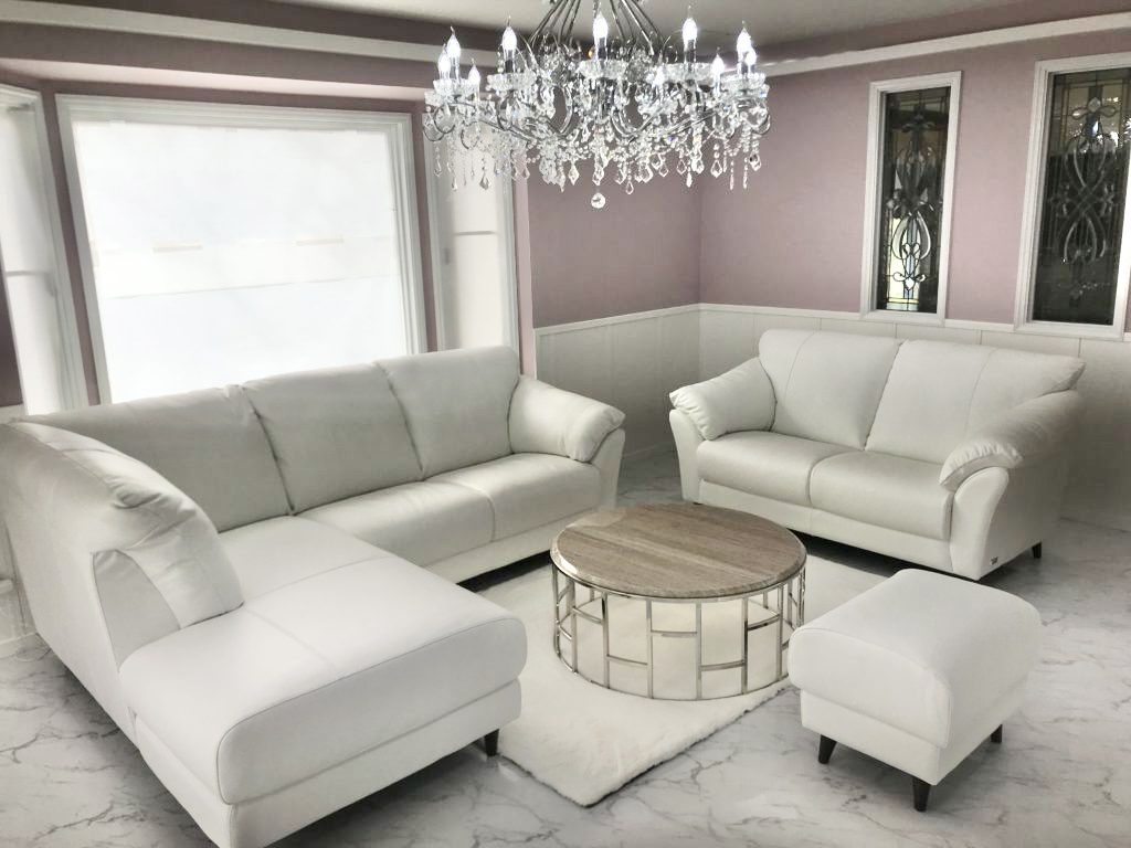 真っ白で存在感があり、包まれるような座り心地が特徴のソファです。