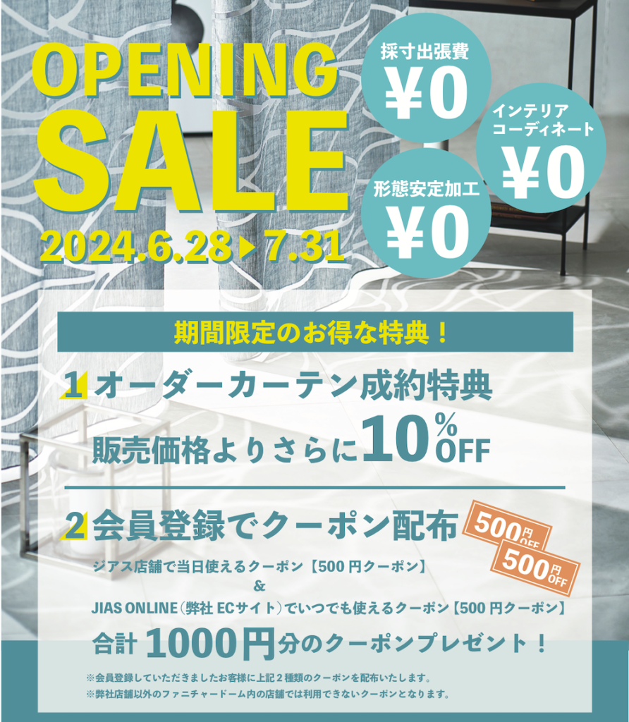 オーダーカーテン&インテリアを取り扱う「JIAS/ジアス名古屋店」さんがファニチャードーム本店1Fにオープン!7月31日(水)まではオープニングセールを開催中です!この機会に是非ジアス名古屋店へお越しくださいませ♪