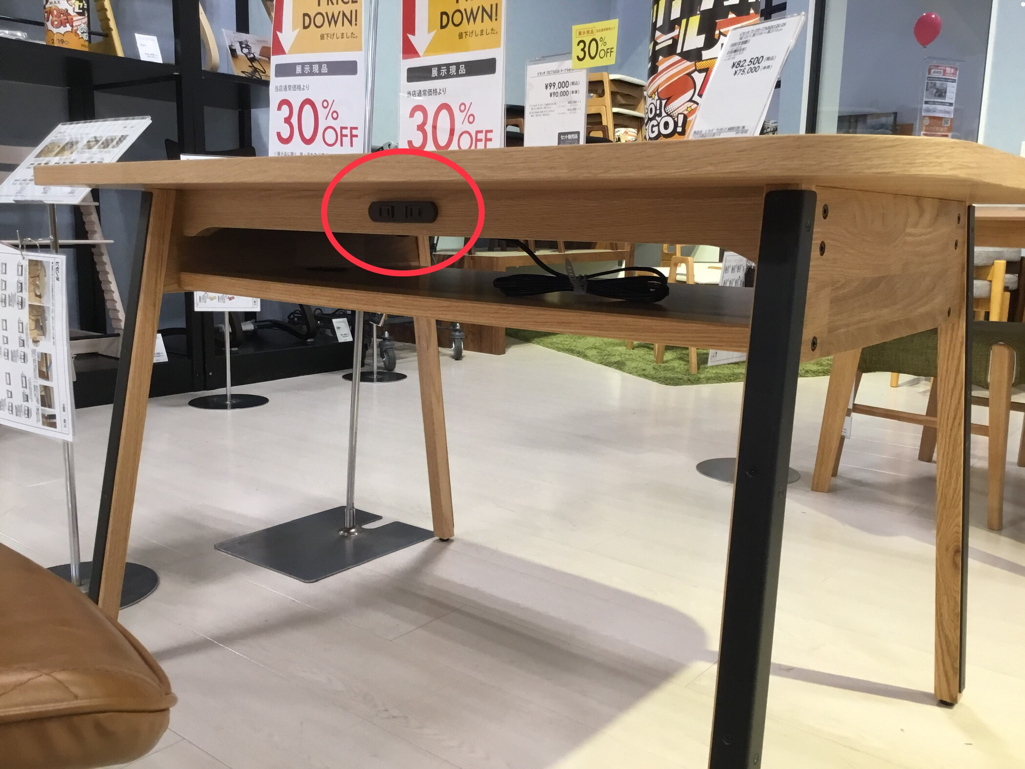 天板下には収納スペースとコンセントがついていて、パソコンなどの作業もできます♪