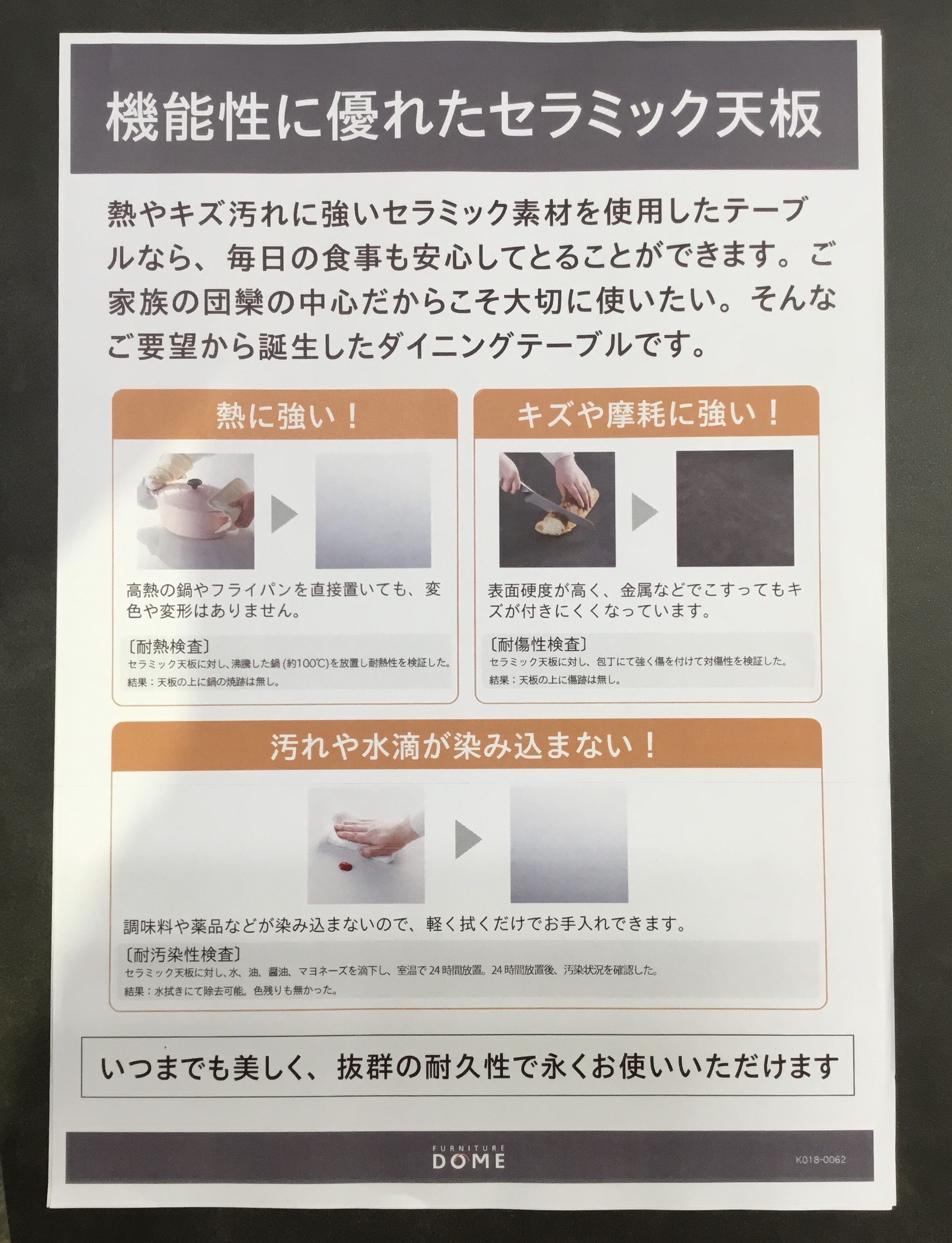 こちらのテーブルはスペイン産のセラミック天板を使用していています。