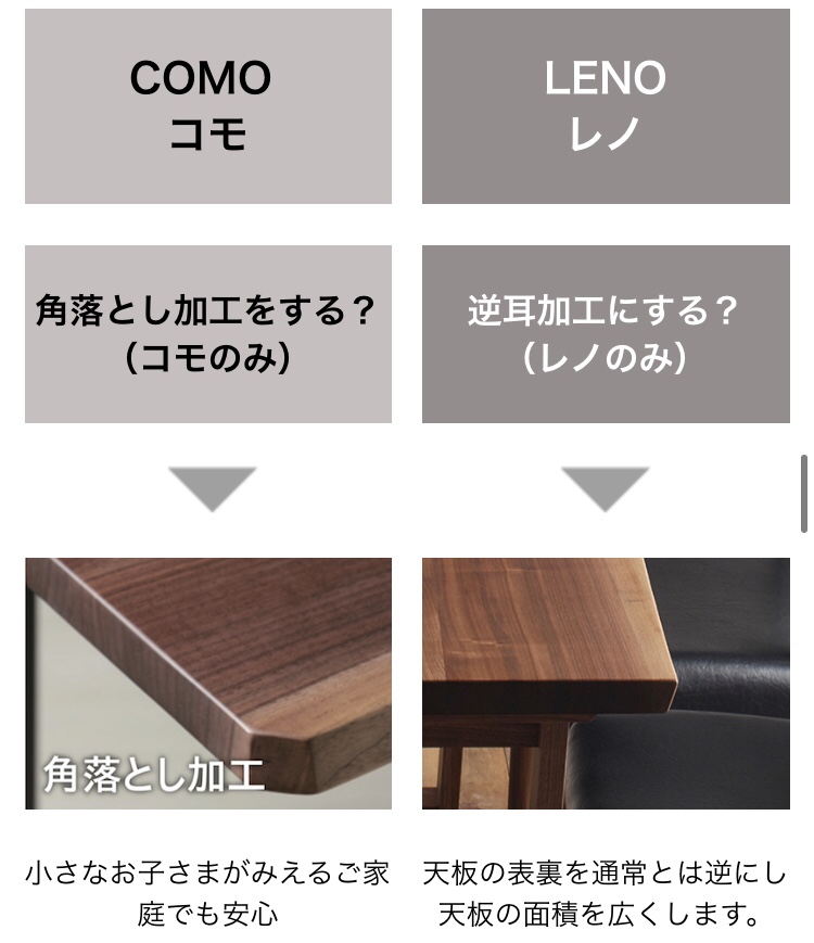 今日は当店で人気の木の温もりと癒される風合いが特徴のオーダーダイニングテーブル『コモ・レノ』シリーズをご紹介します。