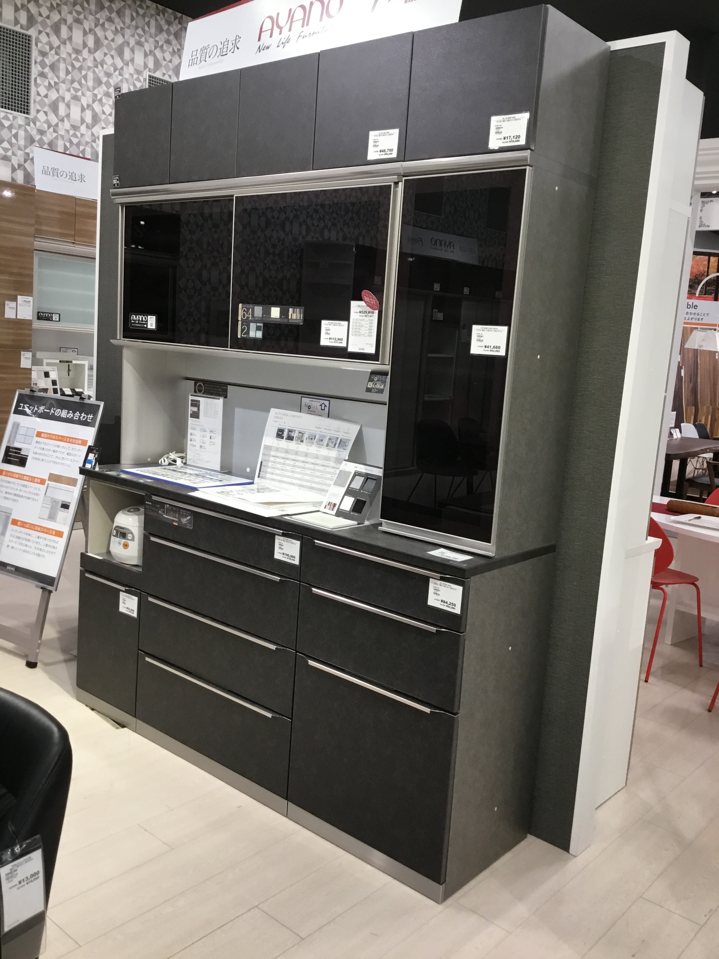 すぐ後ろに展示されているキッチンボードも天板が同じ種類のセラミックでできています。
