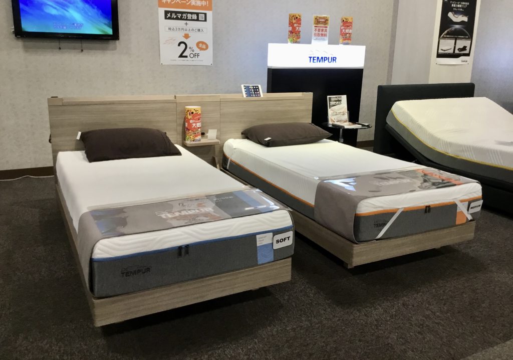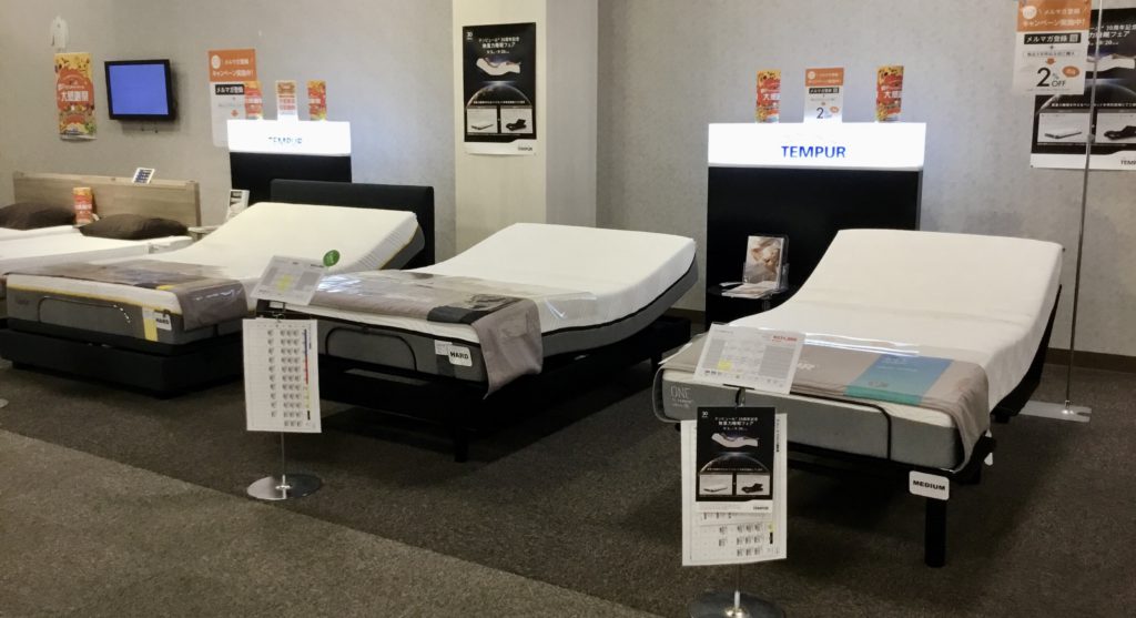 現在、ファニチャードーム本店では、通常のマットレスが2点と電動ベッドが3台、マットレスの硬さを全てお試し頂けるようにご用意しております。
