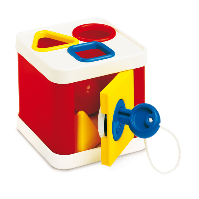 赤ちゃんが好きな指先遊びの動きが揃っています。丸、三角、四角のブロックの色と形合わせ、そして大きなカギで開き閉めすることで手先の器用さを養います。ブロックはどの角度から入れても入るような優れた作りが特徴です。赤ちゃんが好きな鍵を回すと、ギギギと音がするのも楽しさを倍増させてくれる大切な機能です。