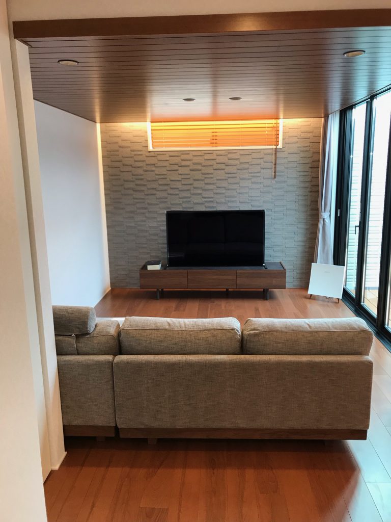 床や壁と色合いを合わせて、まとまりのある落ち着いたリビングルームになりました。