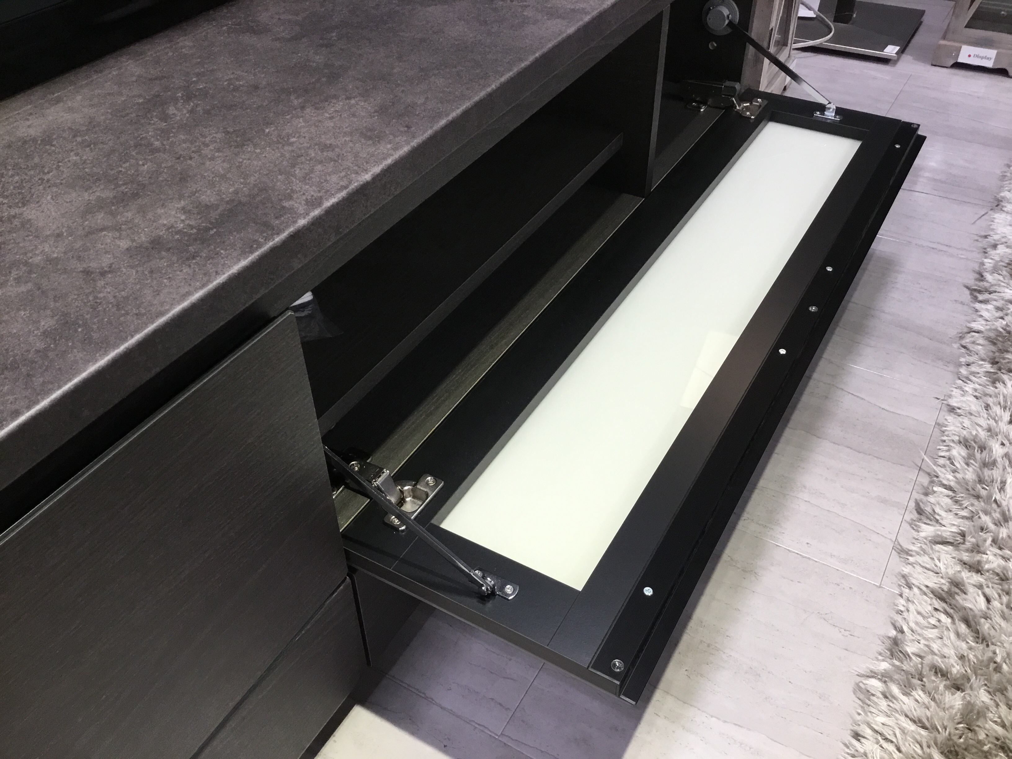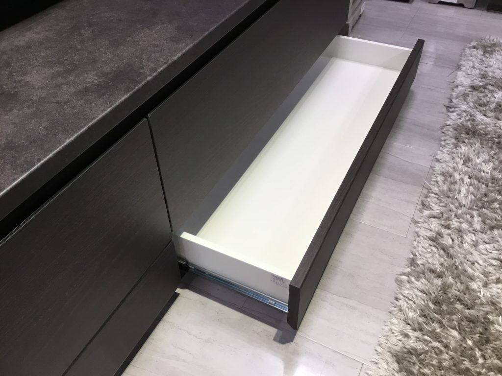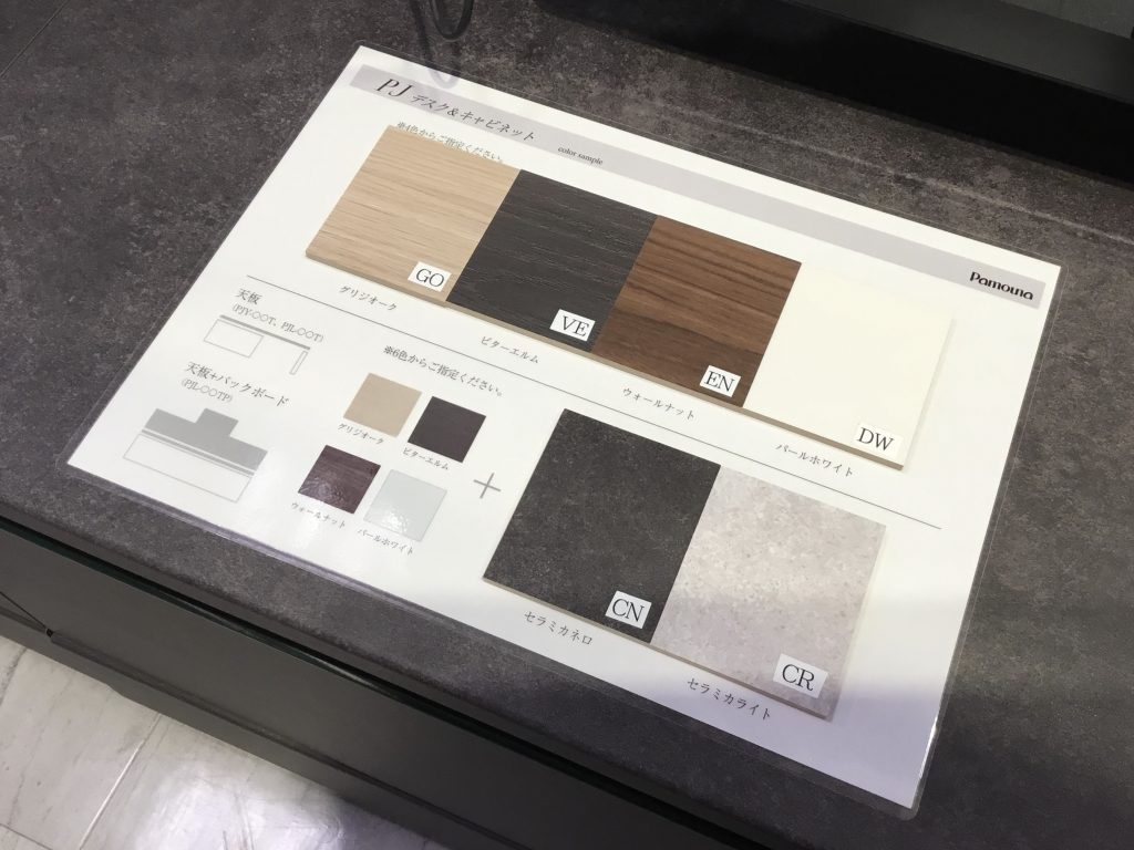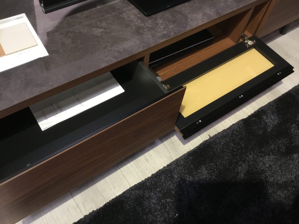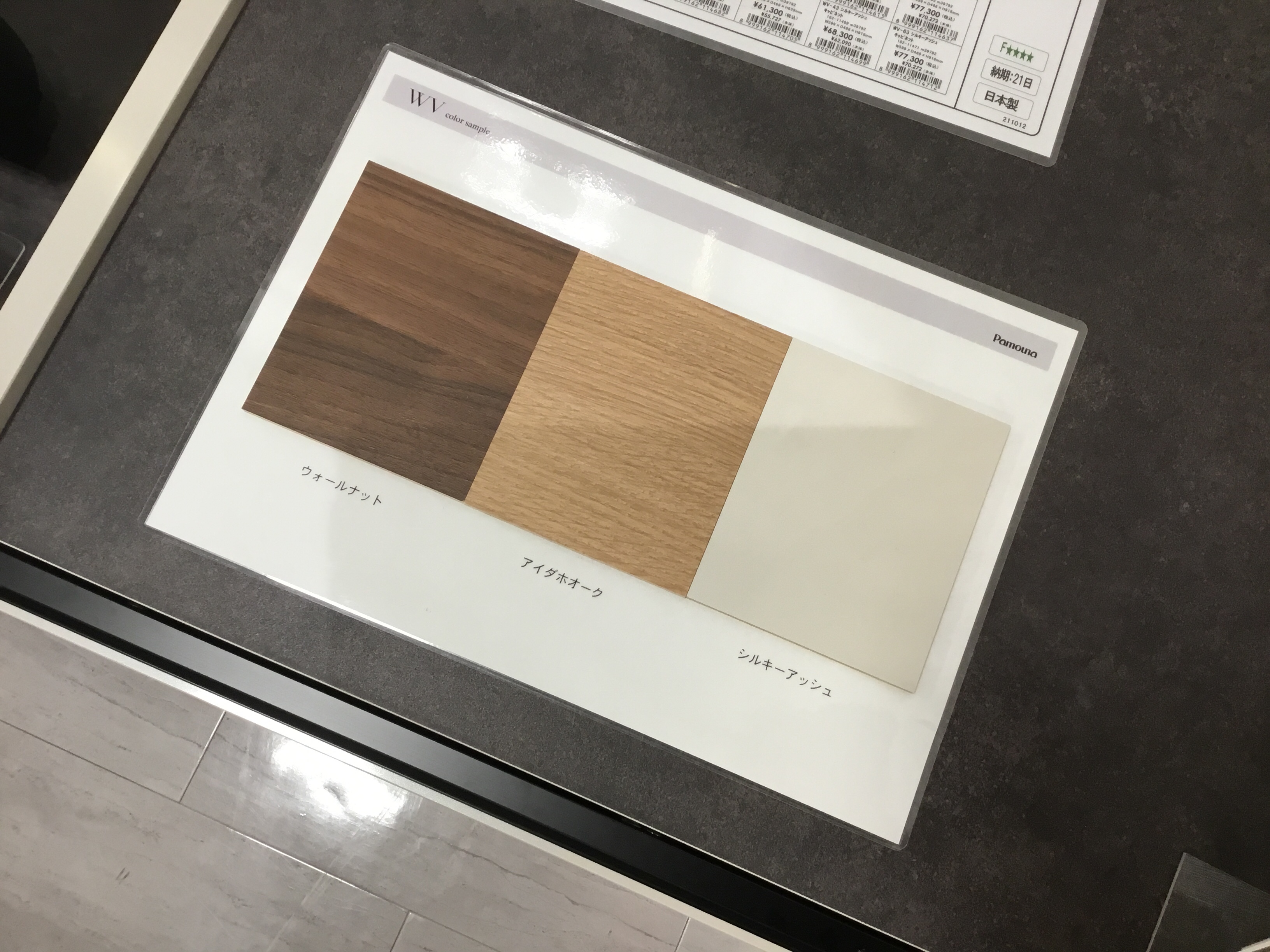 天板はこの濃いグレーのみですが、前板の色は3色から選ぶことができ、当店ではウォールナットとシルキーアッシュの展示があります。