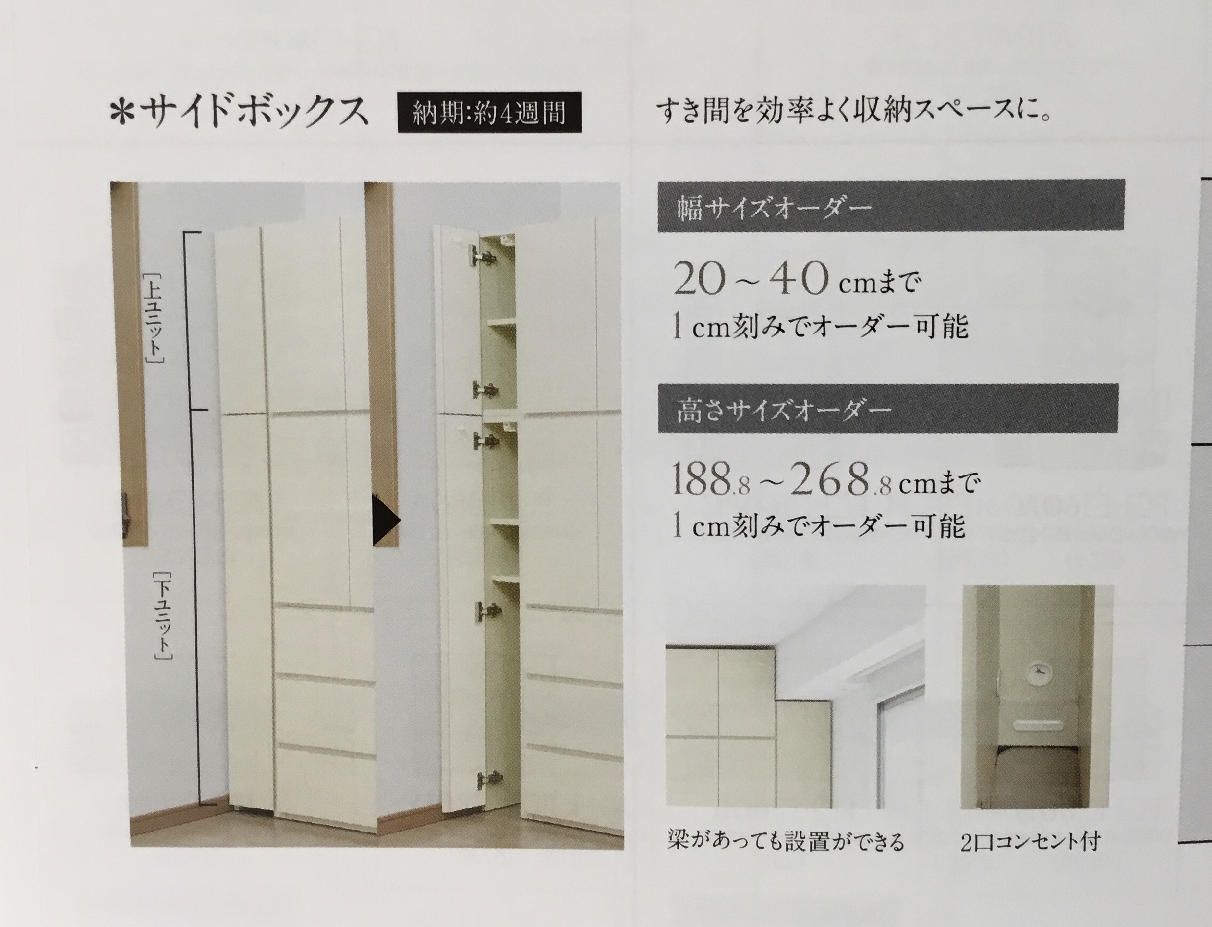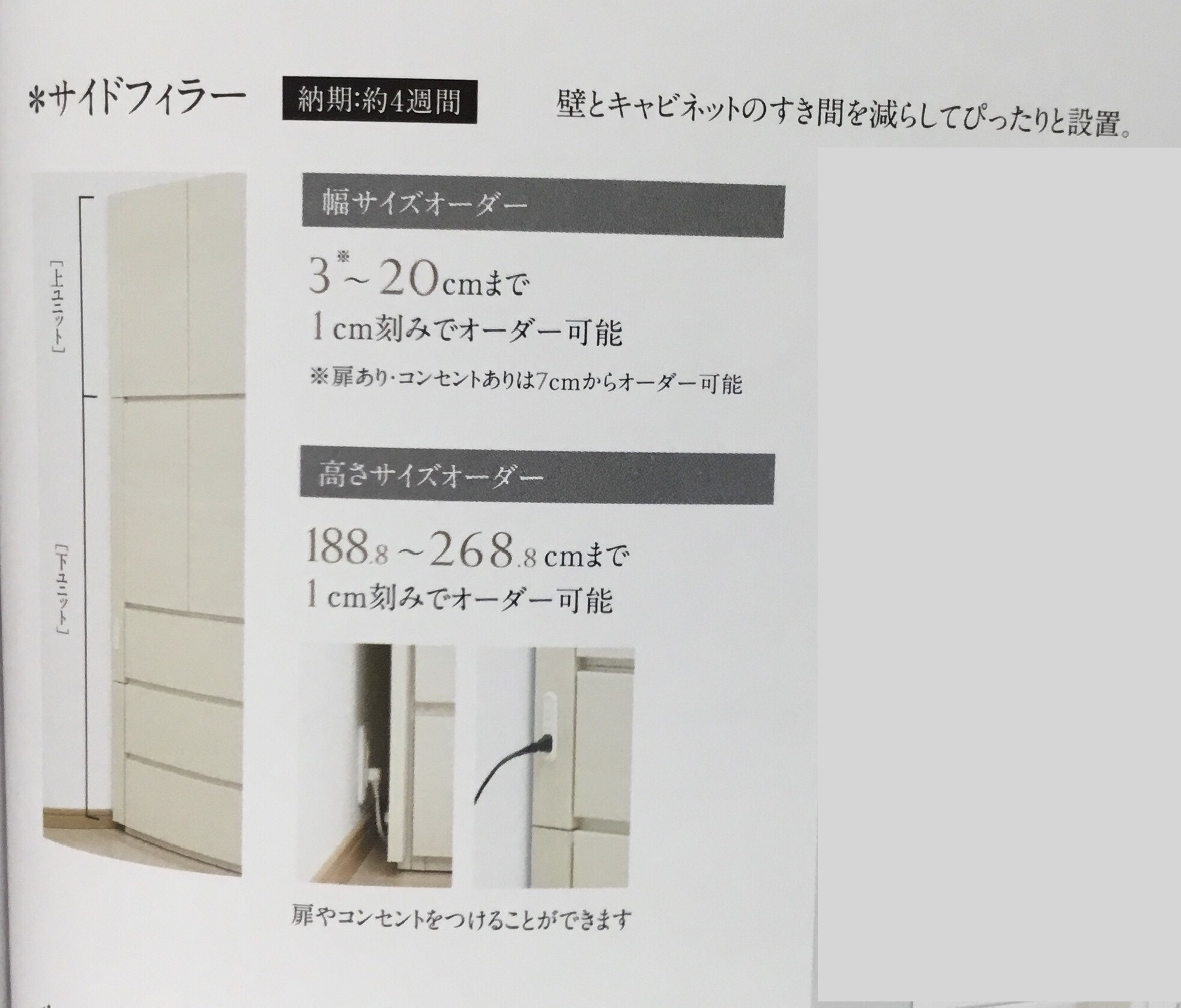 上置きの高さ変更や上置きの梁カットはもちろん、壁との隙間をキレイにうめるサイドボックス、サイドフィラーも作成することができます。