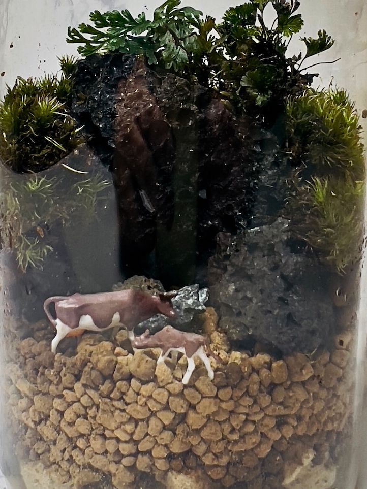溶岩石を立体的に配置して、苔やシダを植え込みされた素敵な作品に仕上がっています。フィギュアは「キツネ」を選ばれました。これから苔やシダが成長してテラリウムの中が変化して、どんどん新しい表情を見ることができると思います。大切に育てて下さいね!