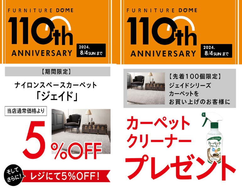 創業110周年記念としてカーペットメーカーさんの蔵出し処分市を開催中(8月4日まで)