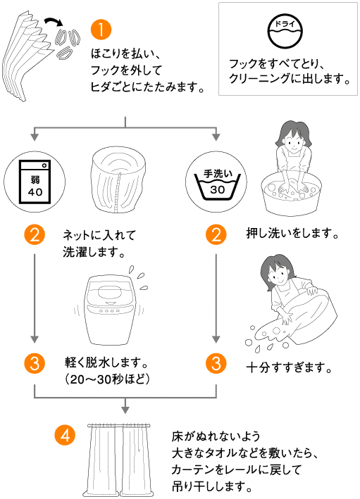 カーテンを掛けてあったカーテンレールに戻して吊り、軽くシワを伸ばすようにして形をととのえ自然乾燥させます。