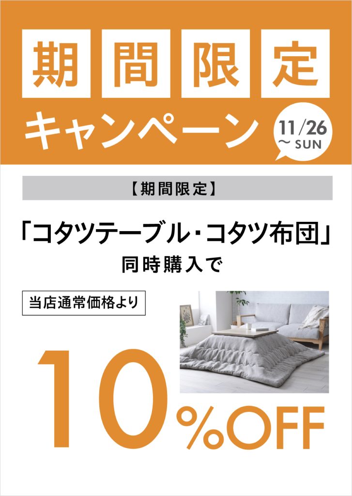 こたつテーブル&こたつ布団を同時購入するとそれぞれ10%OFF