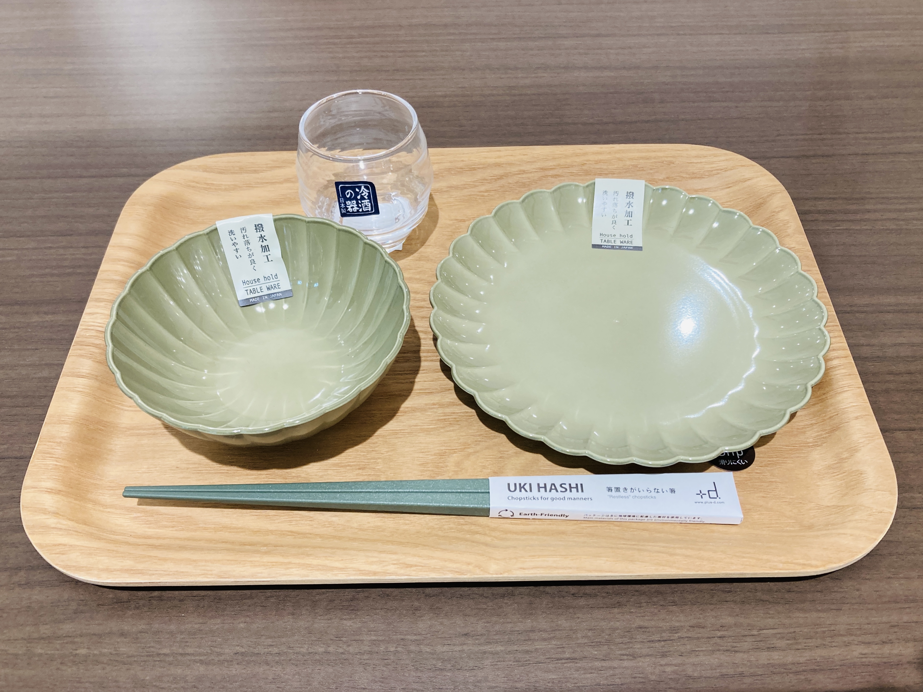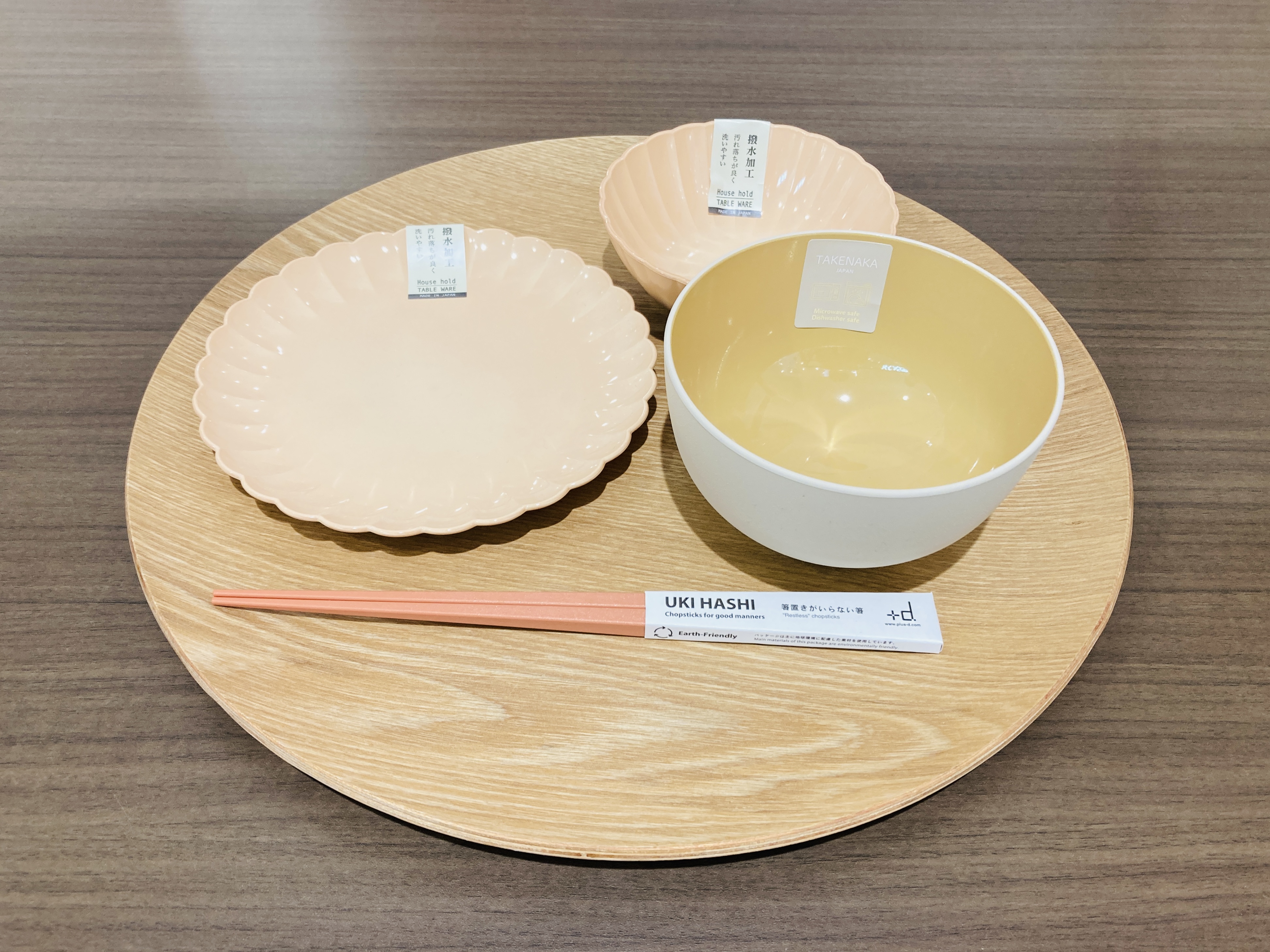 軽くておしやれな樹脂食器(お箸の先端は浮く形状になってます)