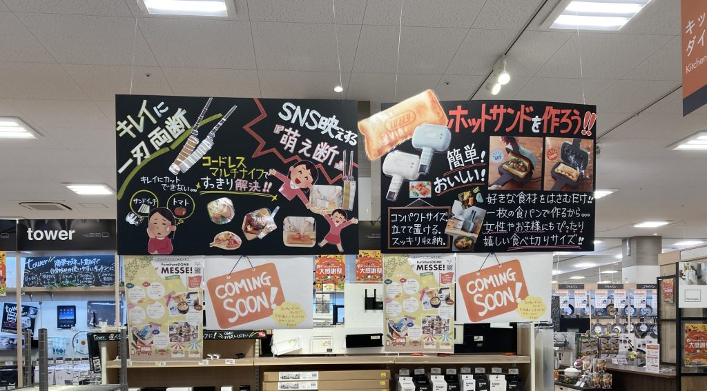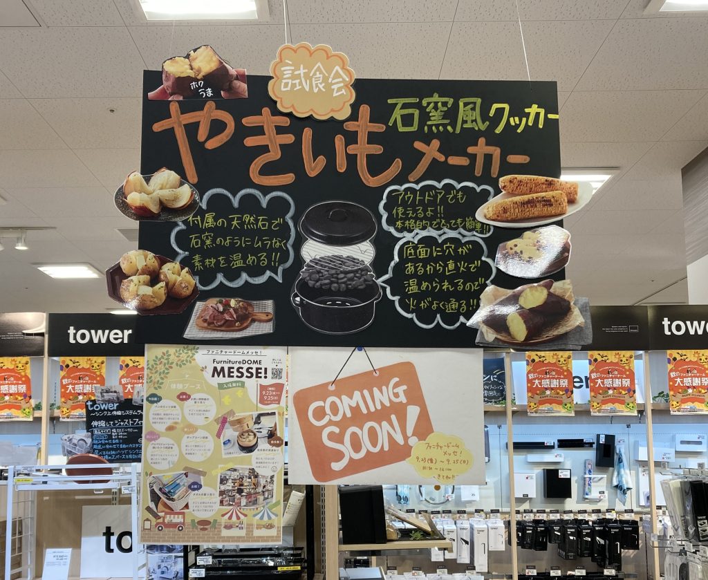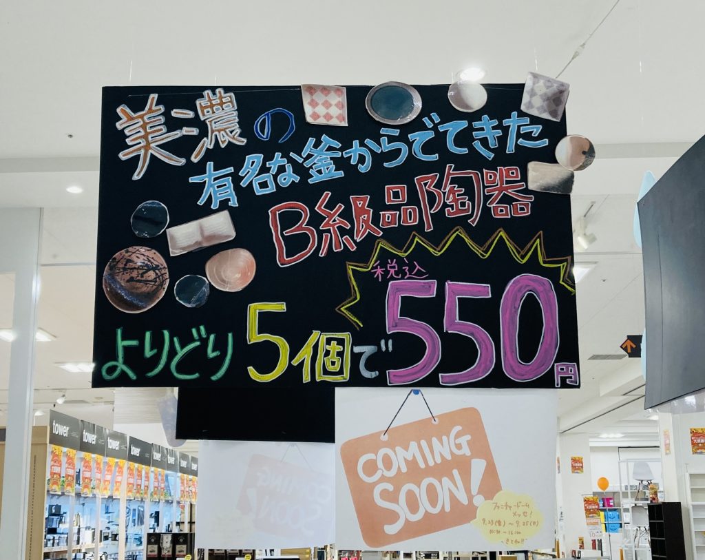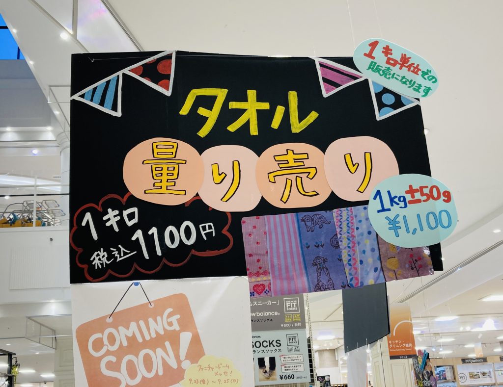 春のメッセで好評タオルの量り売りや早いもの勝ち陶器のコーナーもあります