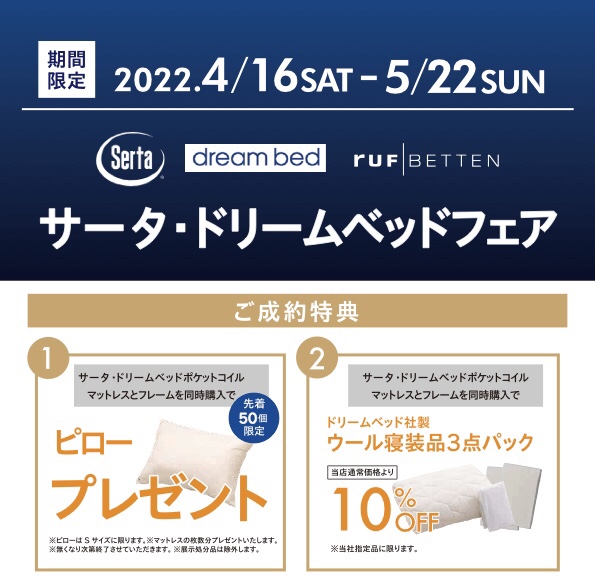 店内の「サータ・ドリームベッドフェア」の特典もございますのでご活用ください。