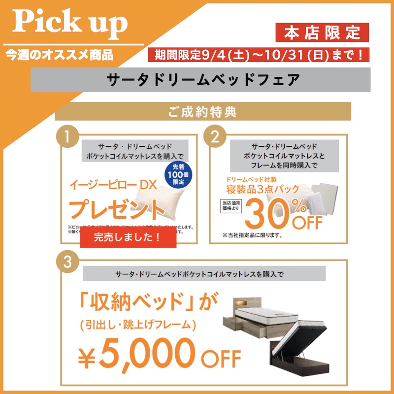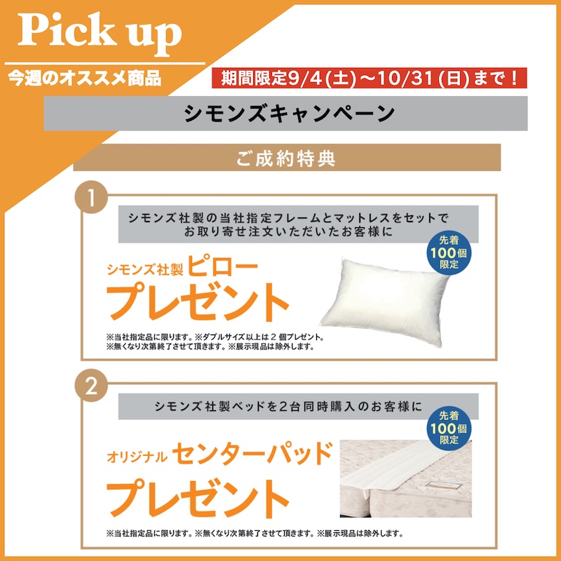約2ヶ月間のサータ ドリームベッドフェアとシモンズキャンペーンも残すところあと2日となり、10月31日(日)で終了となります。
