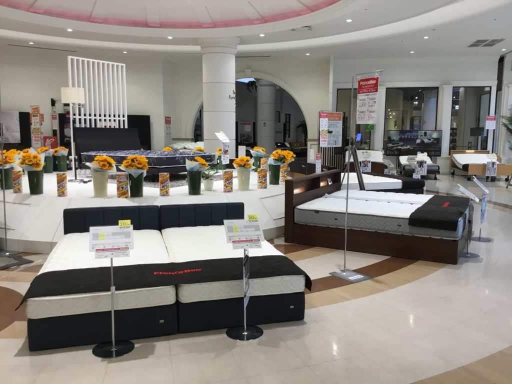 正面出入口前のエスカレーターを2階に上がったところからベッド売場にかけて普段より商品を増やしております。