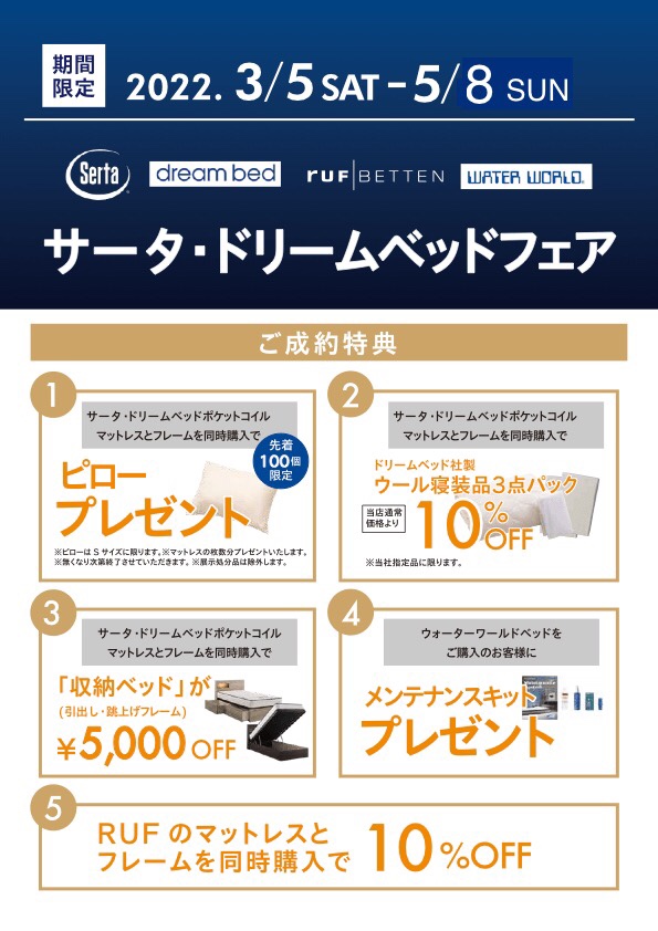 「サータ・ドリームベッドフェア」まだまだ開催中です!!