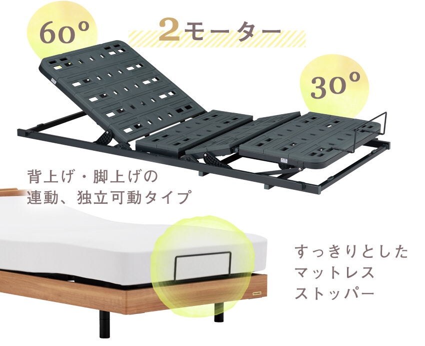 まず、⬆︎画像のベッドはどちらも電動リクライニングベッドですが、今までご紹介してきた商品と異なり、普通のベッドフレームを用いてマットレスをのせ替えてリクライニングベッドにすることができます!