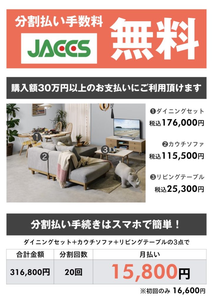 ファニチャードームでは、税込30万円以上のご購入で、20回までの分割手数料無料でお買い物していただけるキャンペーンを開催中です!