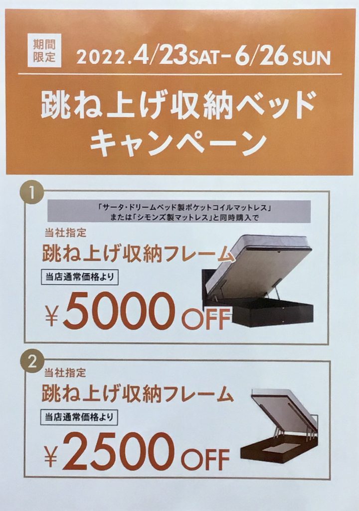 4月23日(土)から始まったベッド売場のキャンペーンの中から、今日は「跳ね上げ収納ベッド」と「グランコローレ」のキャンペーンをご紹介致します。