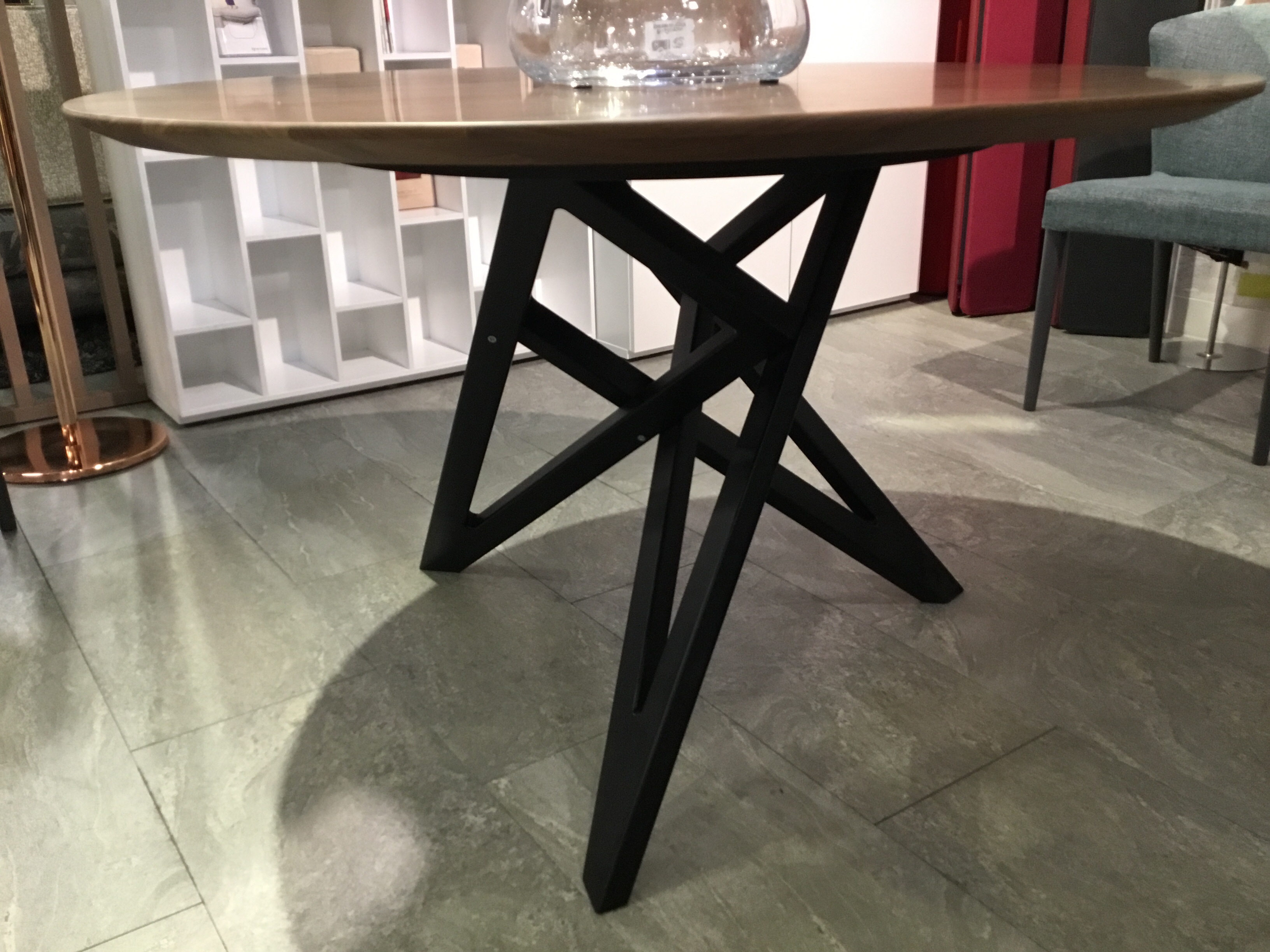 円形の天板と、三角形を組み合わせた美しい形状の脚が特徴で、他にはない素敵なデザインのテーブルです。