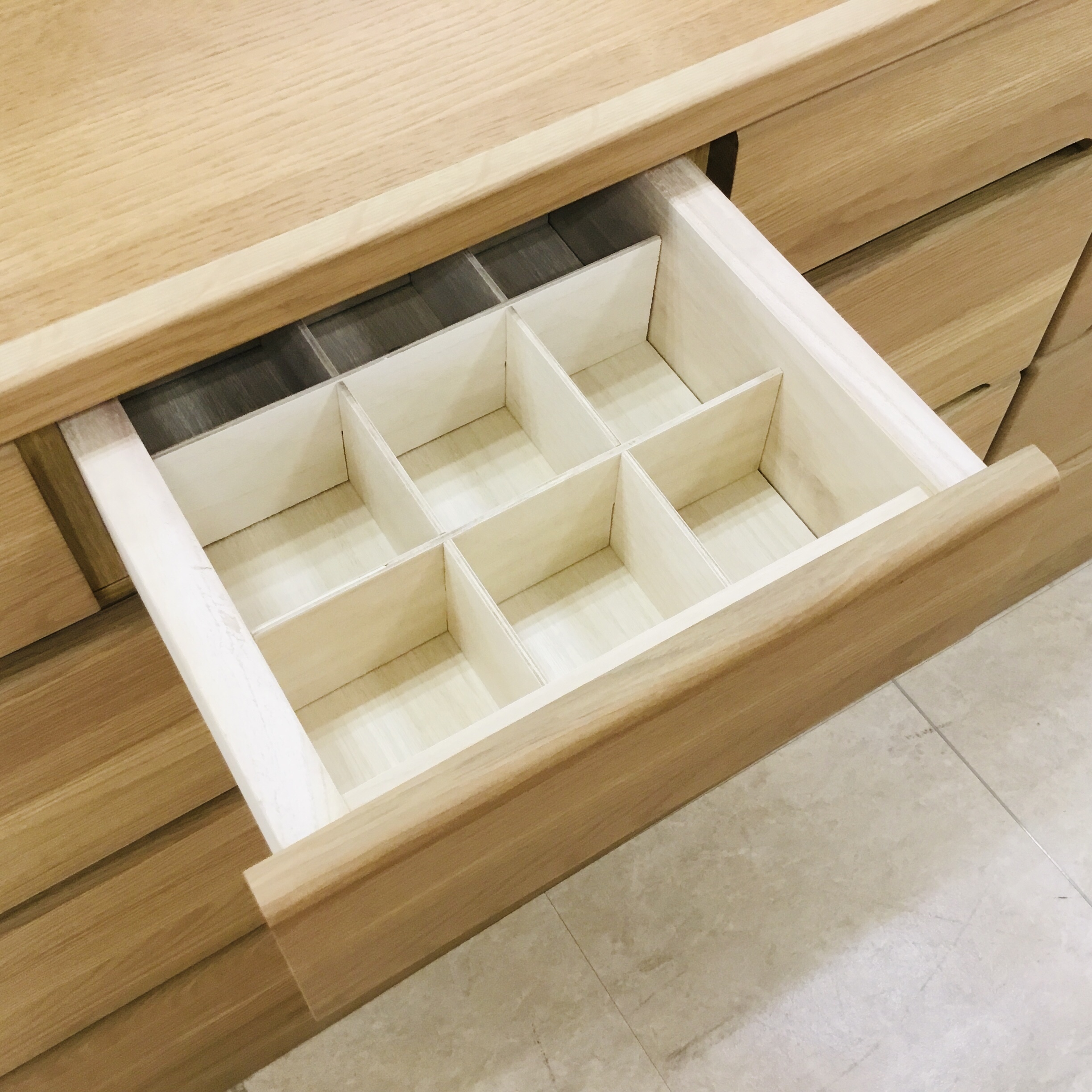 引出しにはフルオープンレールを採用しているので、全て引き出せて出し入れがしやすい仕様になっています(小さい引出しはレール無し)。
