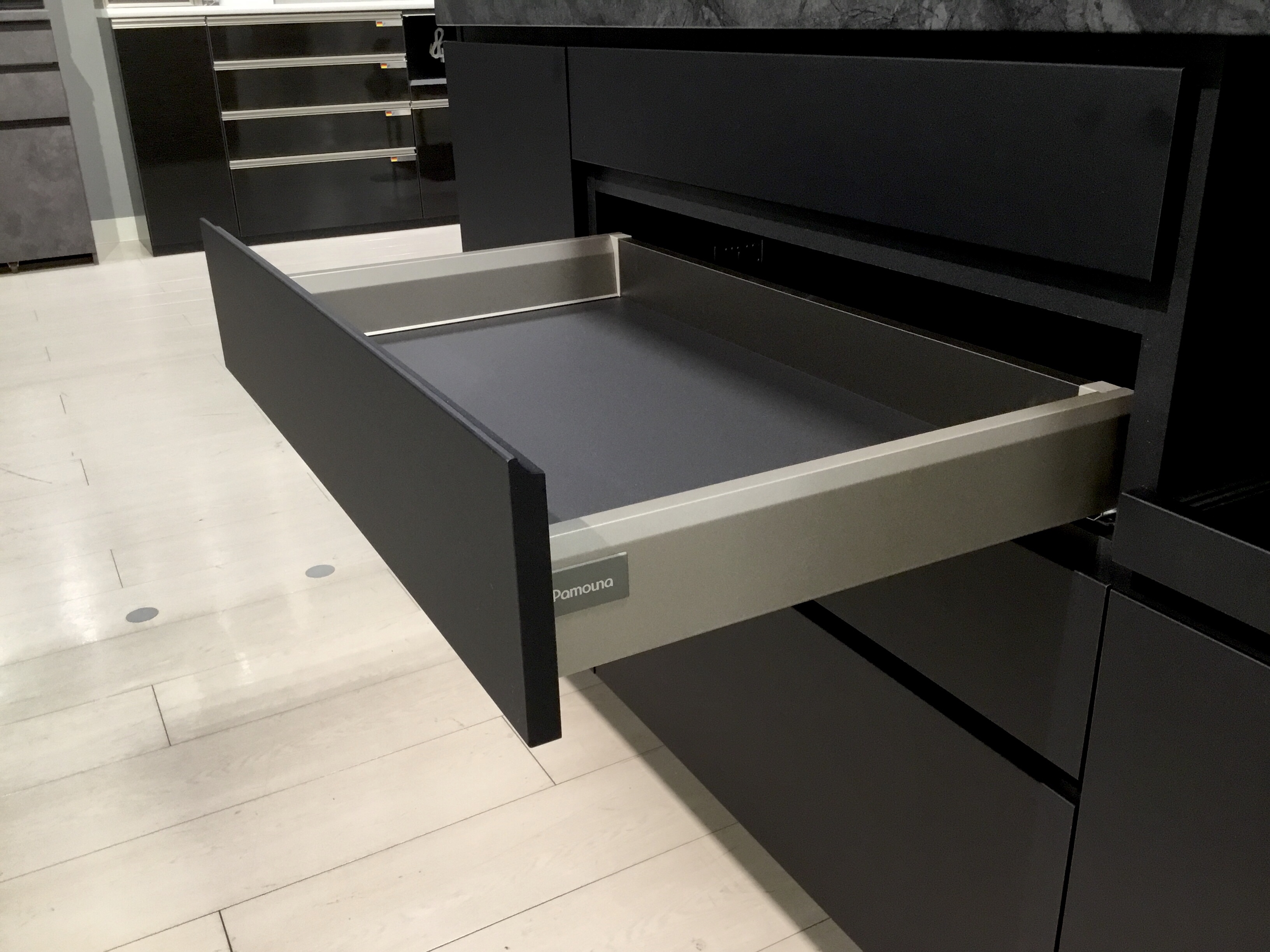 引き出しはパモウナの最上級モデル『ASシリーズ』に使用しているレール耐荷重30kgのアーキテックを採用しています。