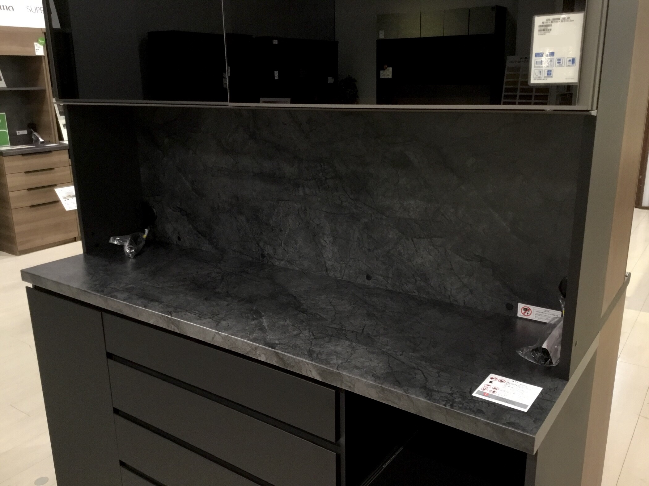 バックボードに持ってくることで、石目柄との対比がより際立ったクールでシンプルなデザインとなっています。