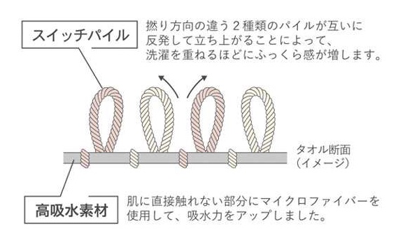 洗うほどに膨らむタオルをテーマに開発されたスイッチパイルを使用