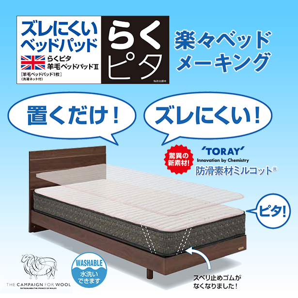 東レ「ミルコット」を使用した、寝返りしてもズレにくいベッドパッドです。