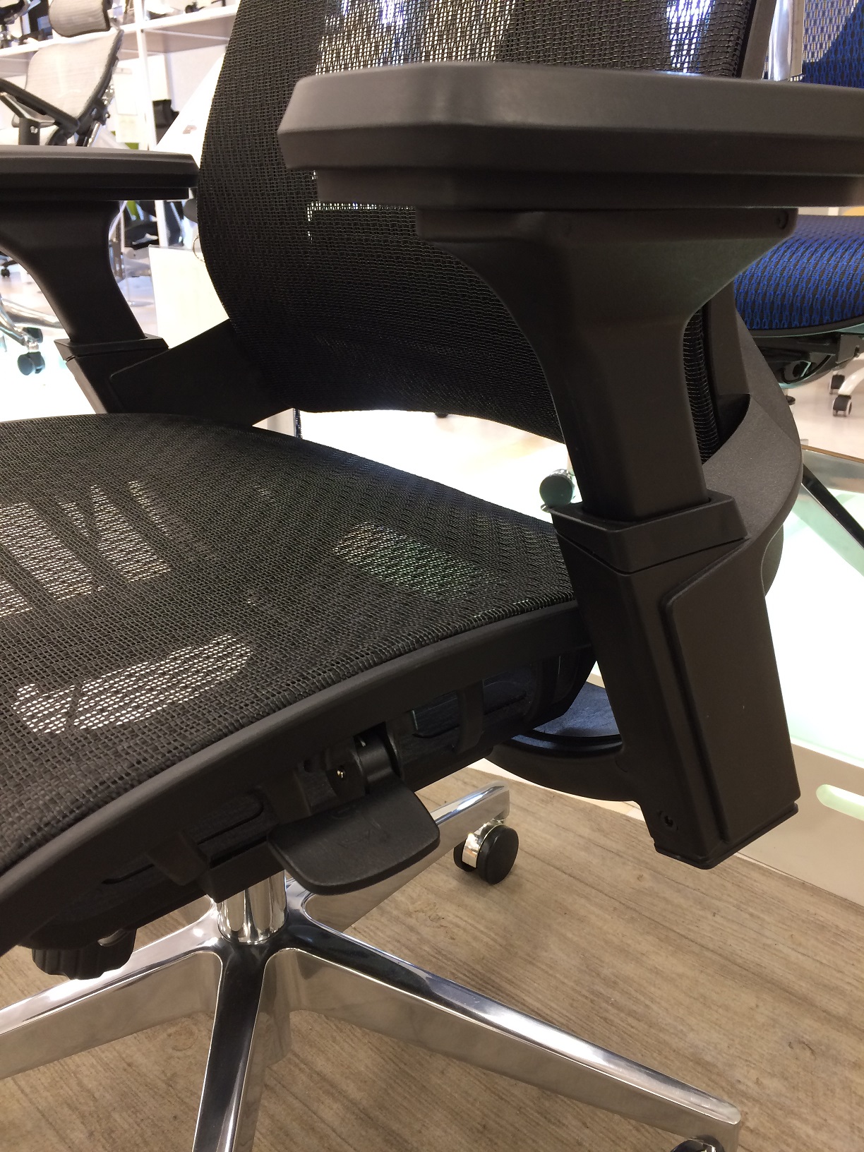 座面したのレバーで座面の昇降、奥行きを調整
