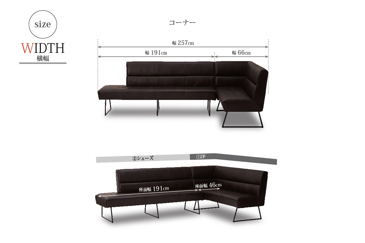 ソファサイズは幅257cmとあえてゆったりとした贅沢なサイズ感で、ダイニングでもくつろぎながら食事が出来るシンプルモダンデザインとなっています。
