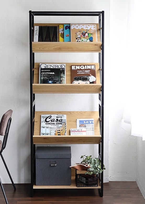 棚板を斜めに取り付けて本・雑誌などコレクションをみせる収納として