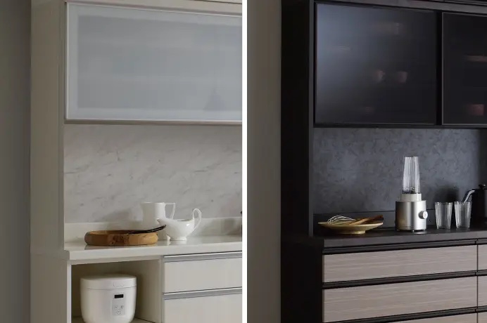 選べるアイテムが豊富で、組み合わせることで、理想の形がつくれる食器棚です。