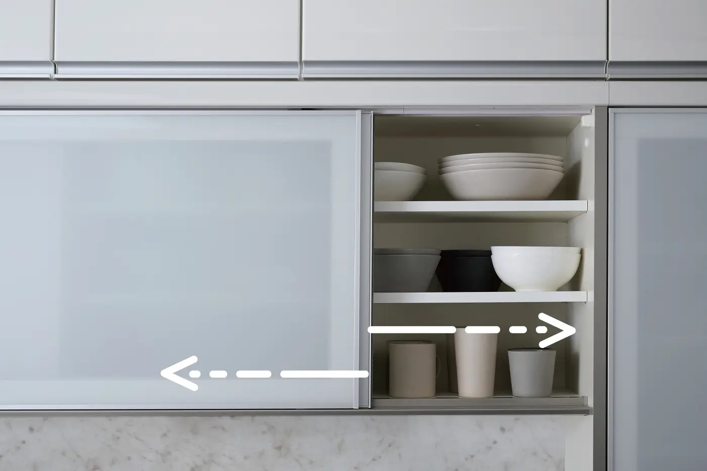 また、内部の食器が見やすく、取り出しやすいワイドビュー設計の引き戸となっています。